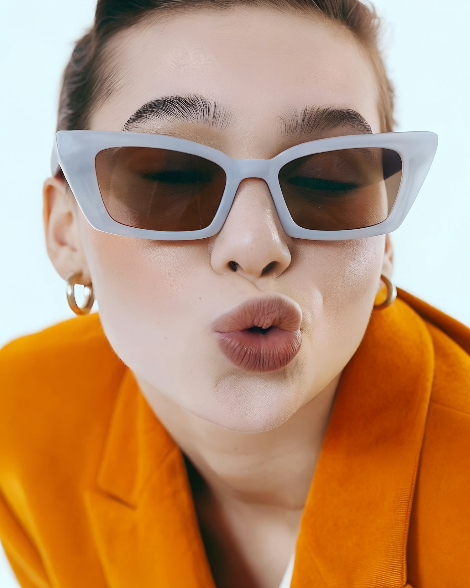 Stylish woman in white cat-eye sunglasses, orange blazer, and gold hoops, playfully blowing a kiss against a light blue background.
