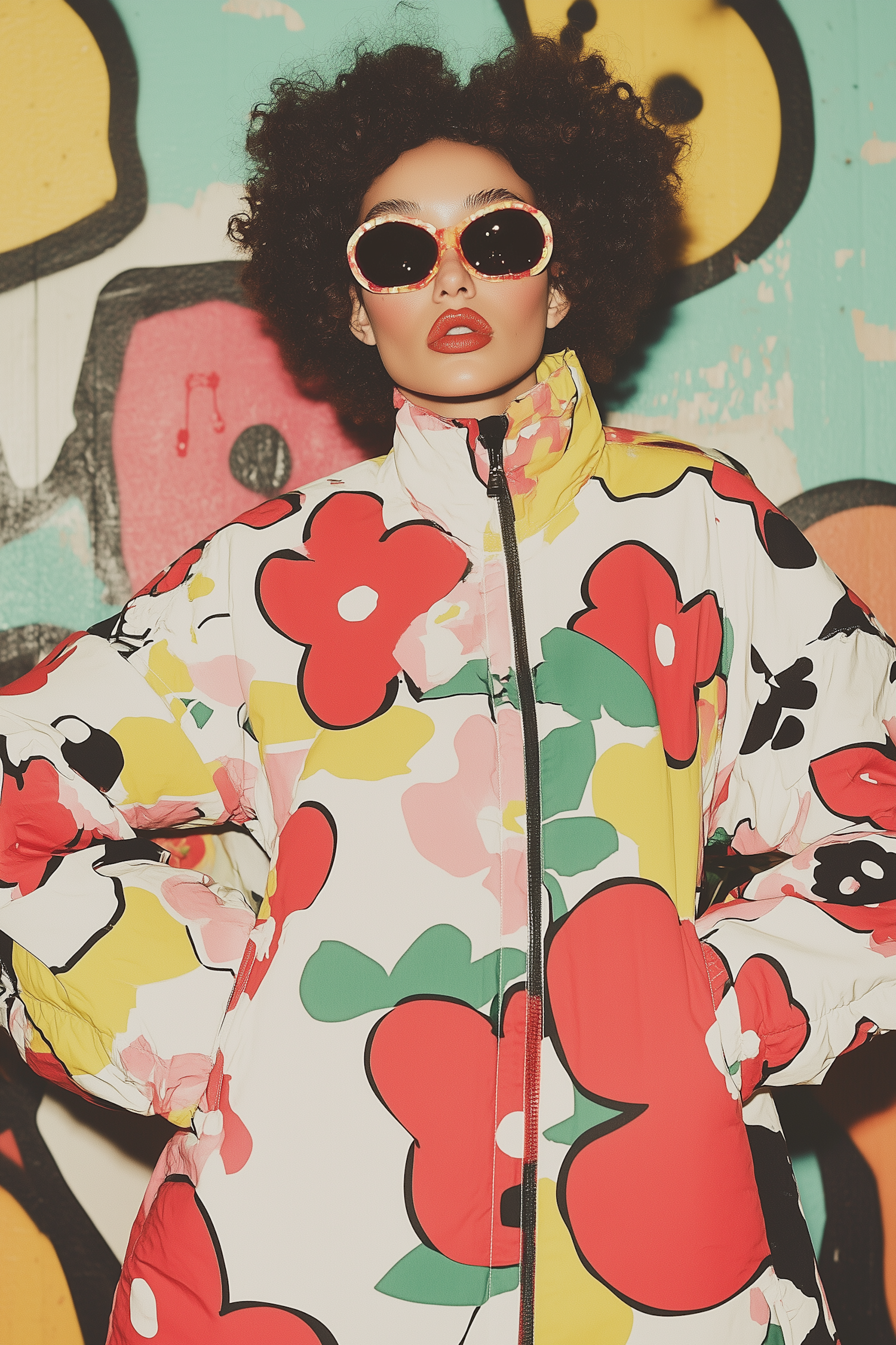 A fashionable woman in a bold floral puffer jacket and patterned sunglasses poses against a colorful graffiti wall.
