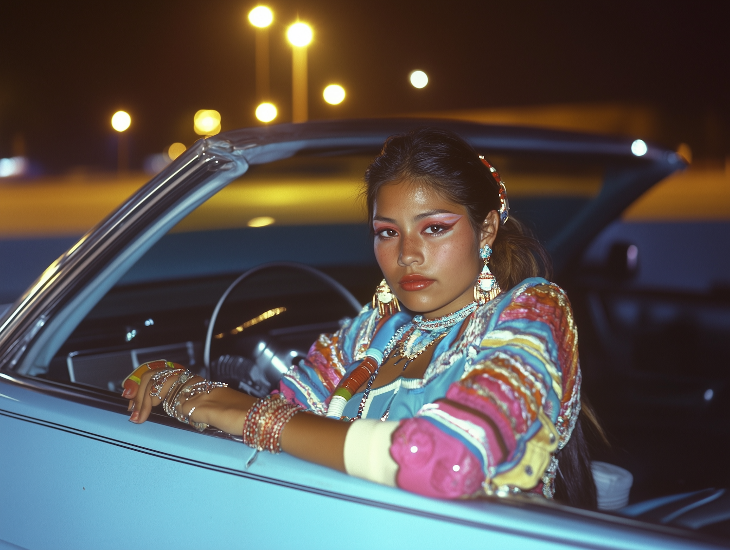 Stylish woman in a vintage convertible at night, wearing bold makeup, colorful attire, and statement jewelry under glowing streetlights.