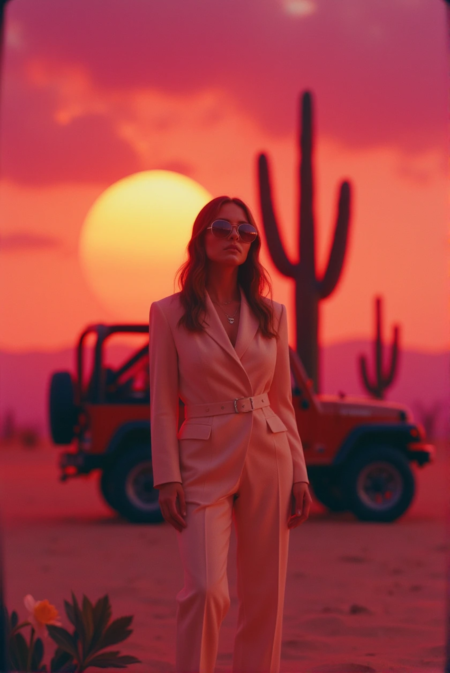 Stylish woman in a beige suit and sunglasses stands in a desert at sunset, with a red jeep and cacti in the background.