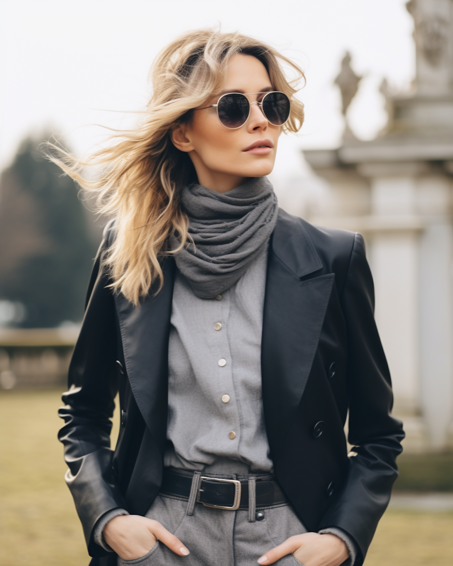 Stylish woman in sunglasses and leather jacket, standing outdoors with a confident pose. Blonde hair, gray scarf, and elegant attire.