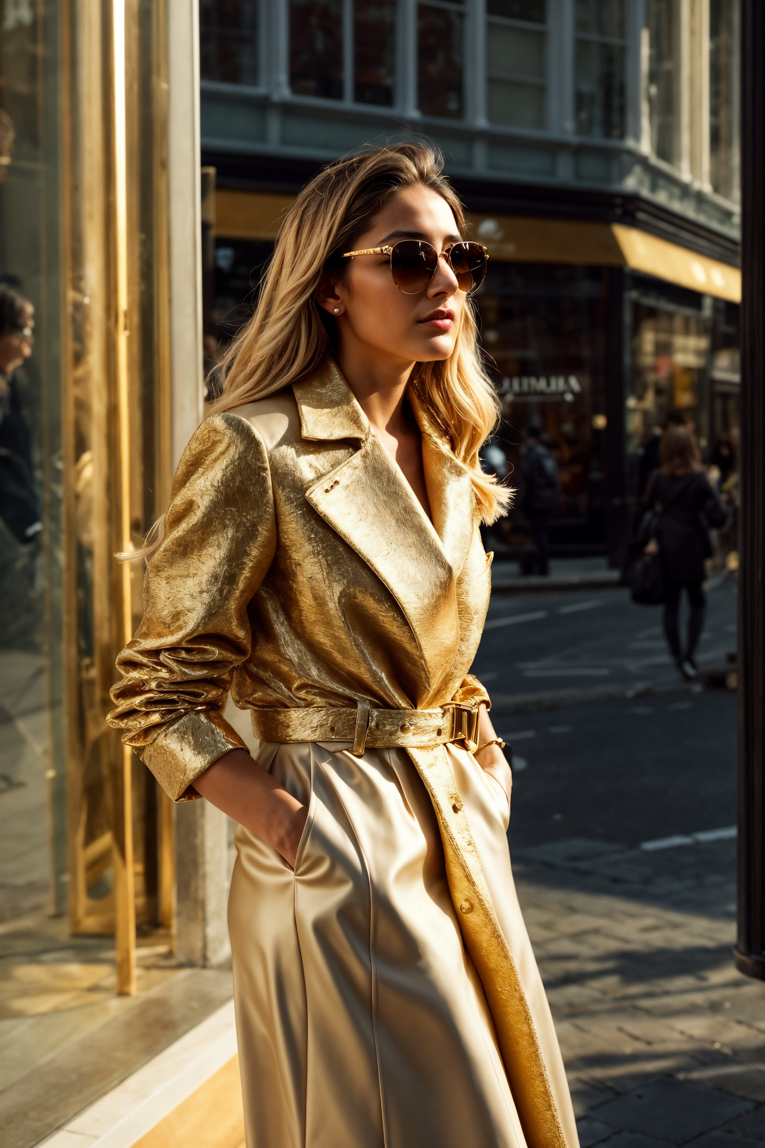 Elegant woman in a metallic gold trench coat and sunglasses, exuding glamour on a sunlit city street with urban storefronts.