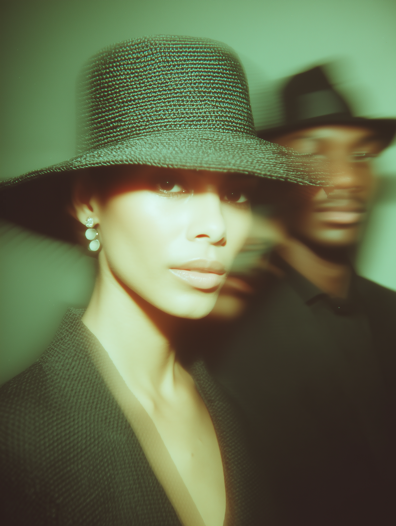 A stylish woman in a wide-brimmed hat and blazer stands in focus, with a blurred man in the background, creating a dreamy, artistic vibe.