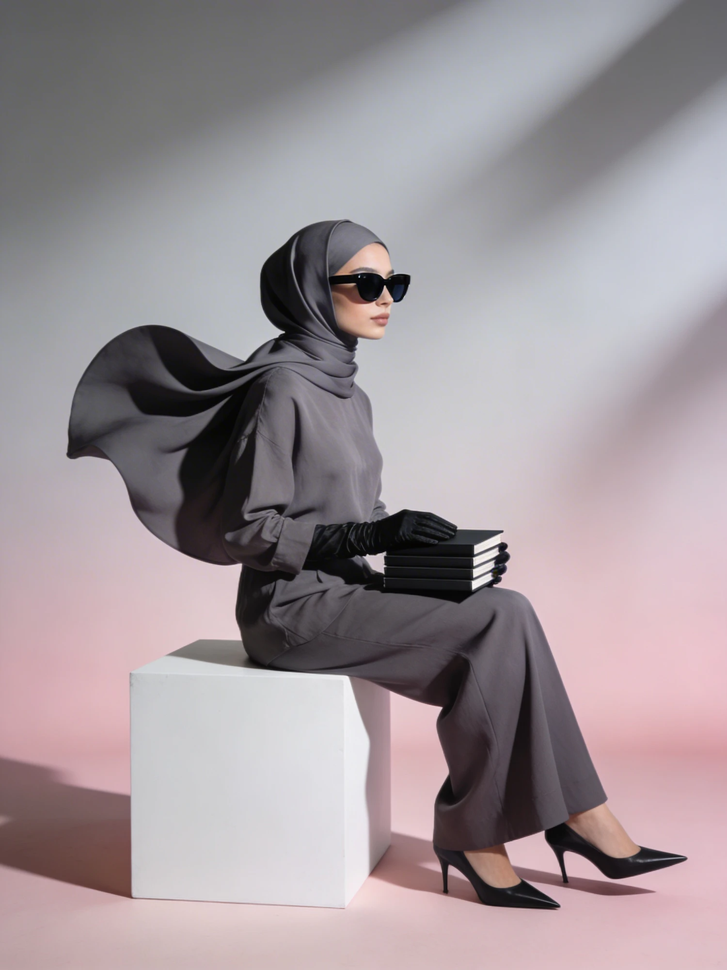 Stylish woman in a gray outfit and hijab, holding books, seated on a white cube against a pink-gray gradient background.