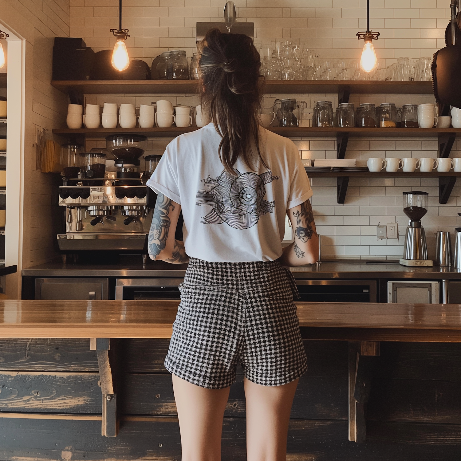 Tattooed woman in a white graphic tee and houndstooth shorts stands in a rustic café with a coffee station and warm lighting.