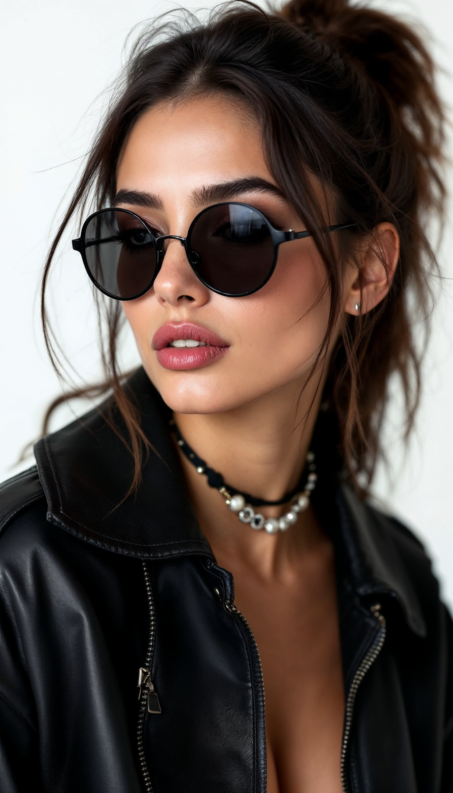 Stylish woman in black sunglasses and leather jacket, with a chic choker necklace and messy bun hairstyle.