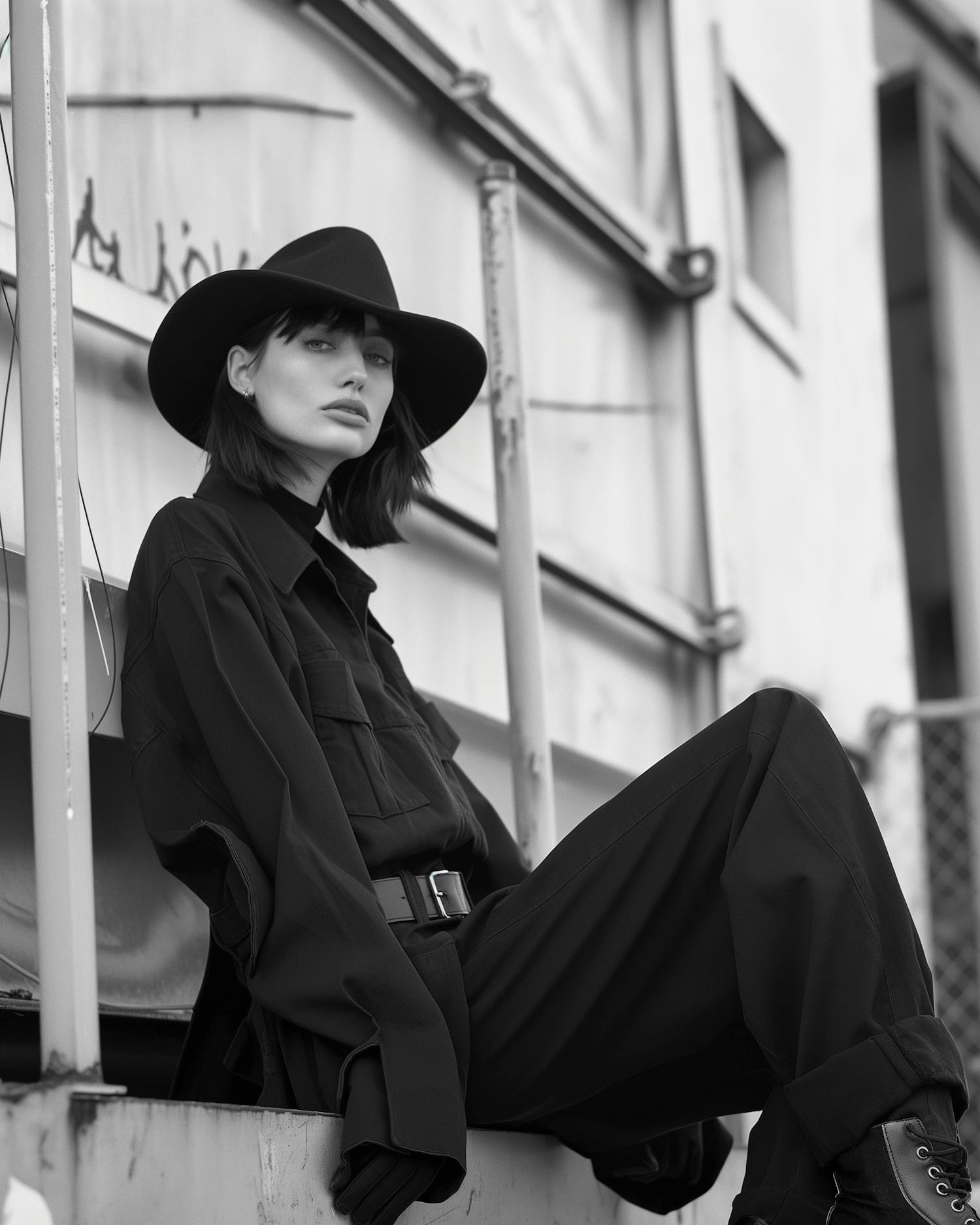 Stylish woman in black attire and hat poses confidently in an industrial setting, captured in a dramatic black and white photo.