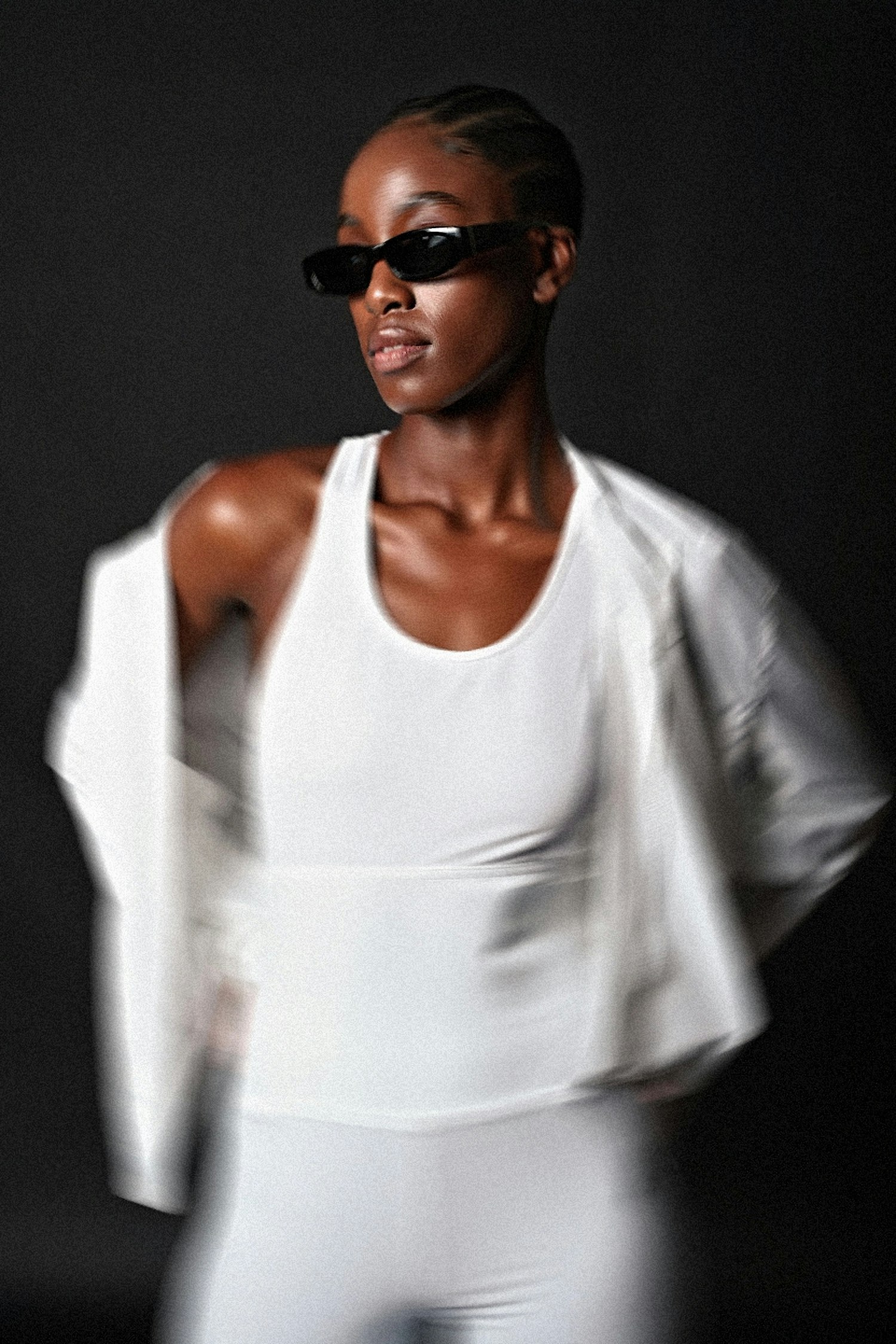 Stylish Black woman in white activewear and sunglasses, posing confidently with a blurred motion effect against a dark background.