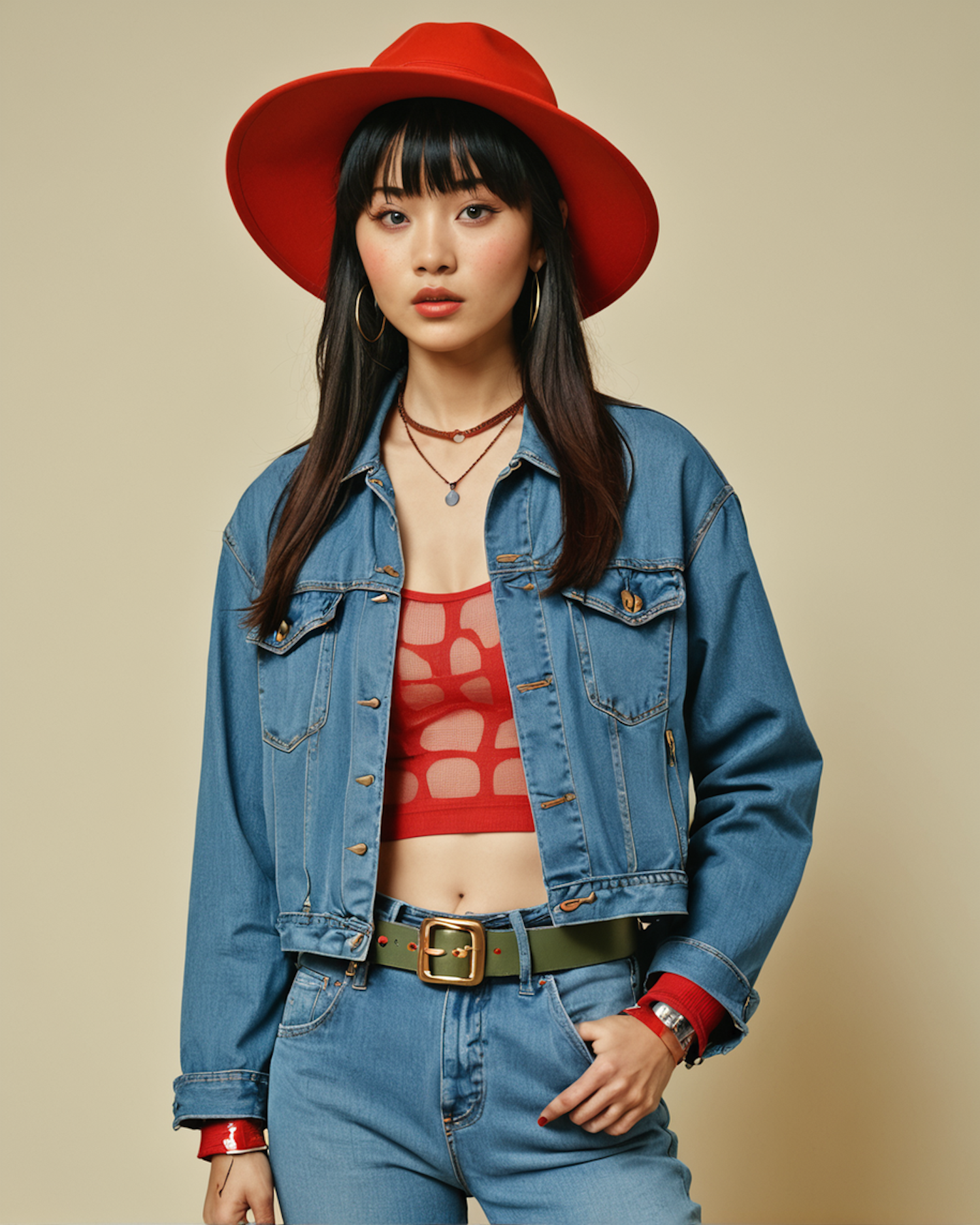 Stylish woman in denim and a red hat, accessorized with a green belt, gold earrings, and layered necklaces against a beige background.
