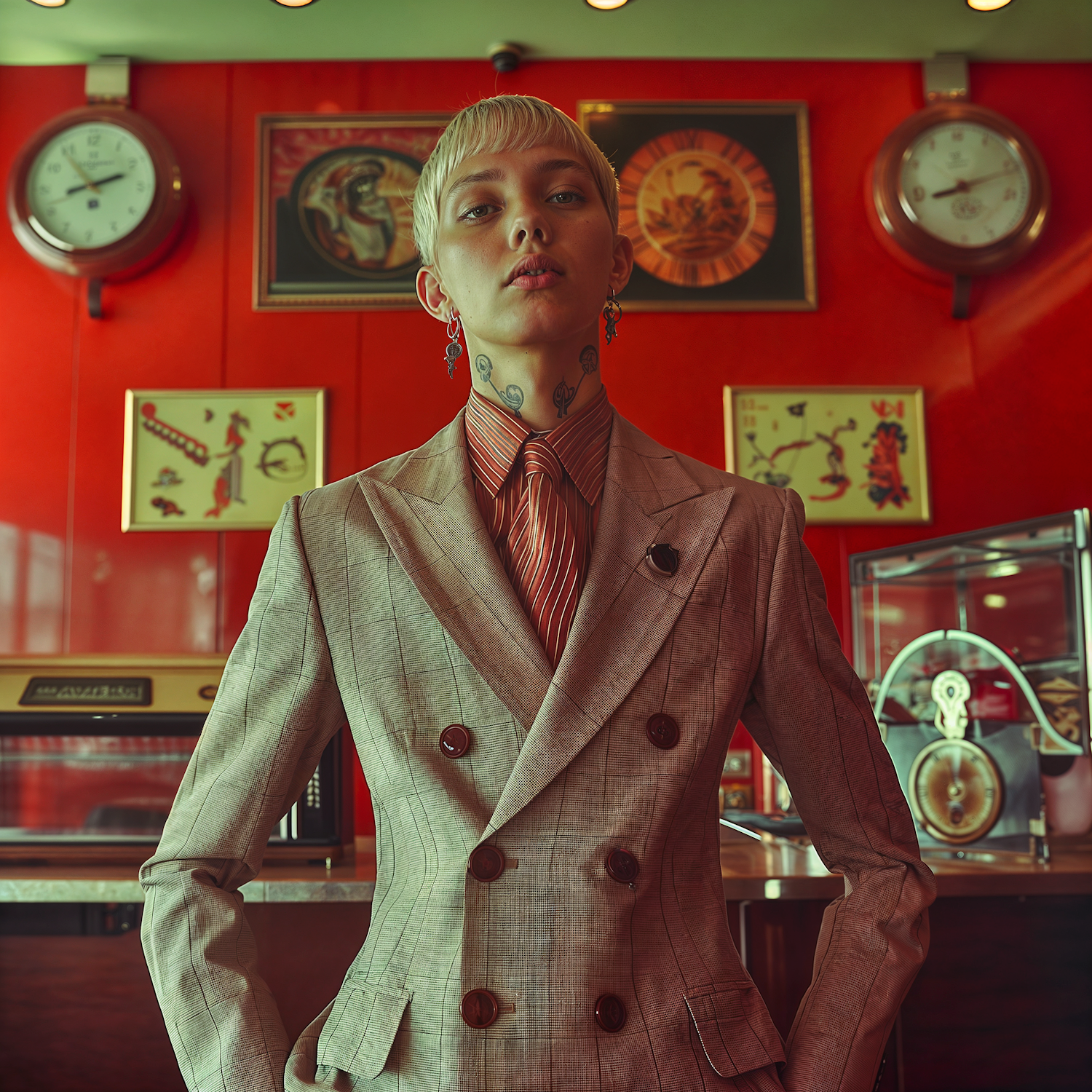 Person in a plaid suit with tattoos stands in a retro diner with red walls and vintage decor.