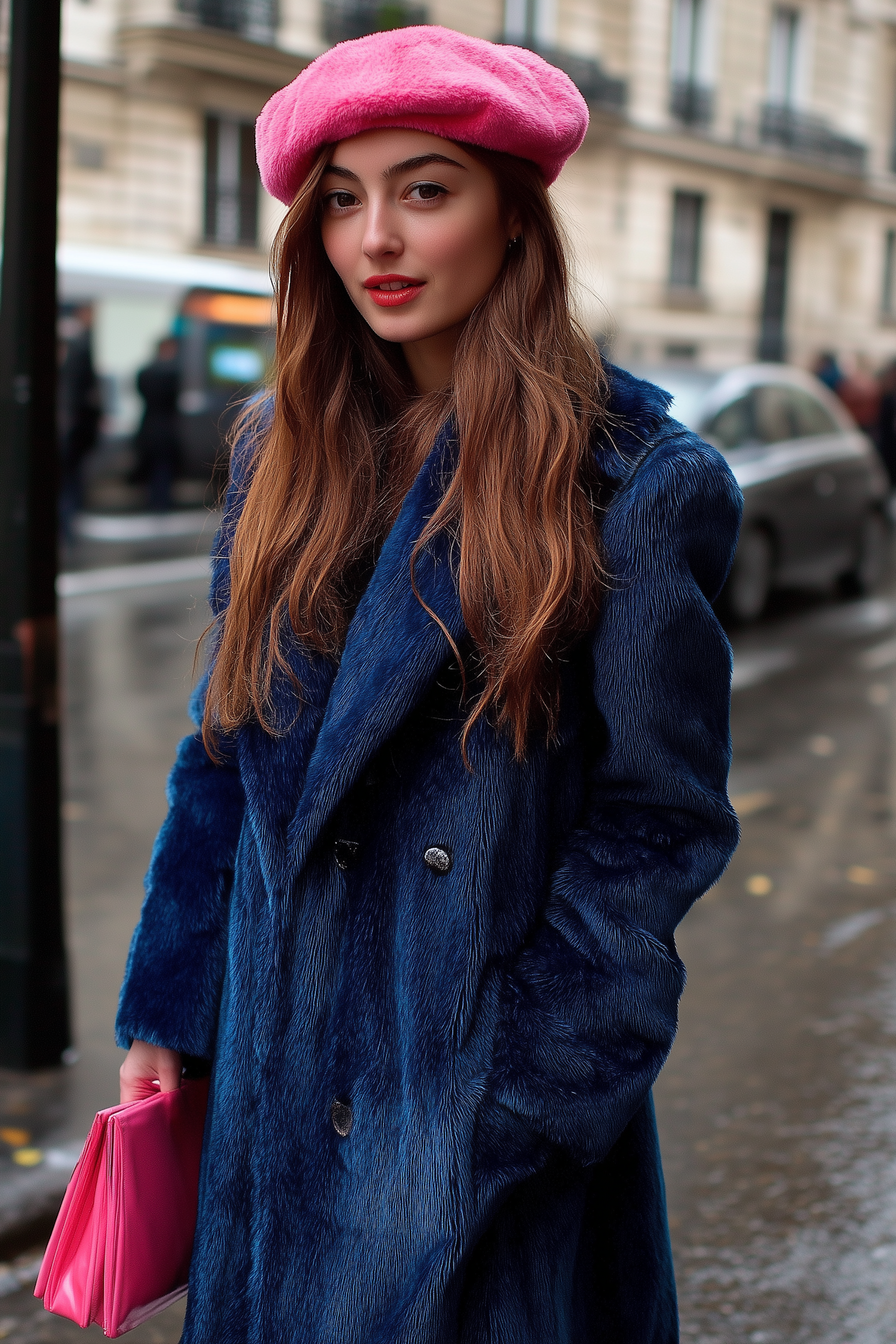 Stylish woman in a pink beret and blue fur coat holds a matching pink clutch on a city street, exuding confidence and elegance.