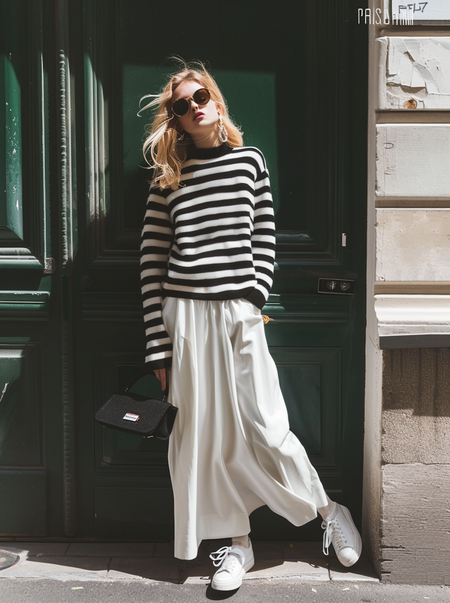 Fashionable woman in striped sweater and white skirt poses against a green door, exuding modern style with sunglasses and sneakers.