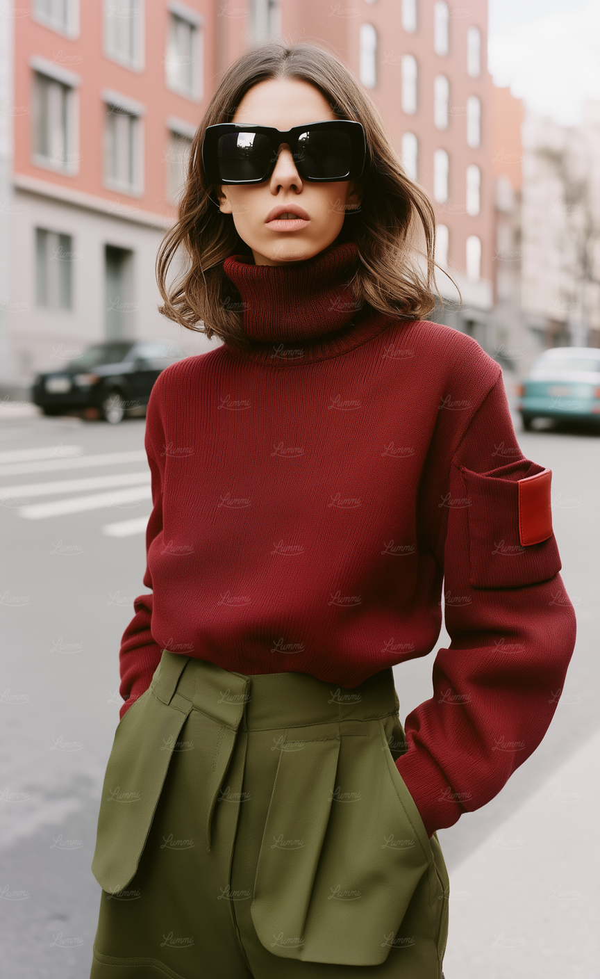 Stylish woman in maroon turtleneck and olive pants with oversized sunglasses on a city street.