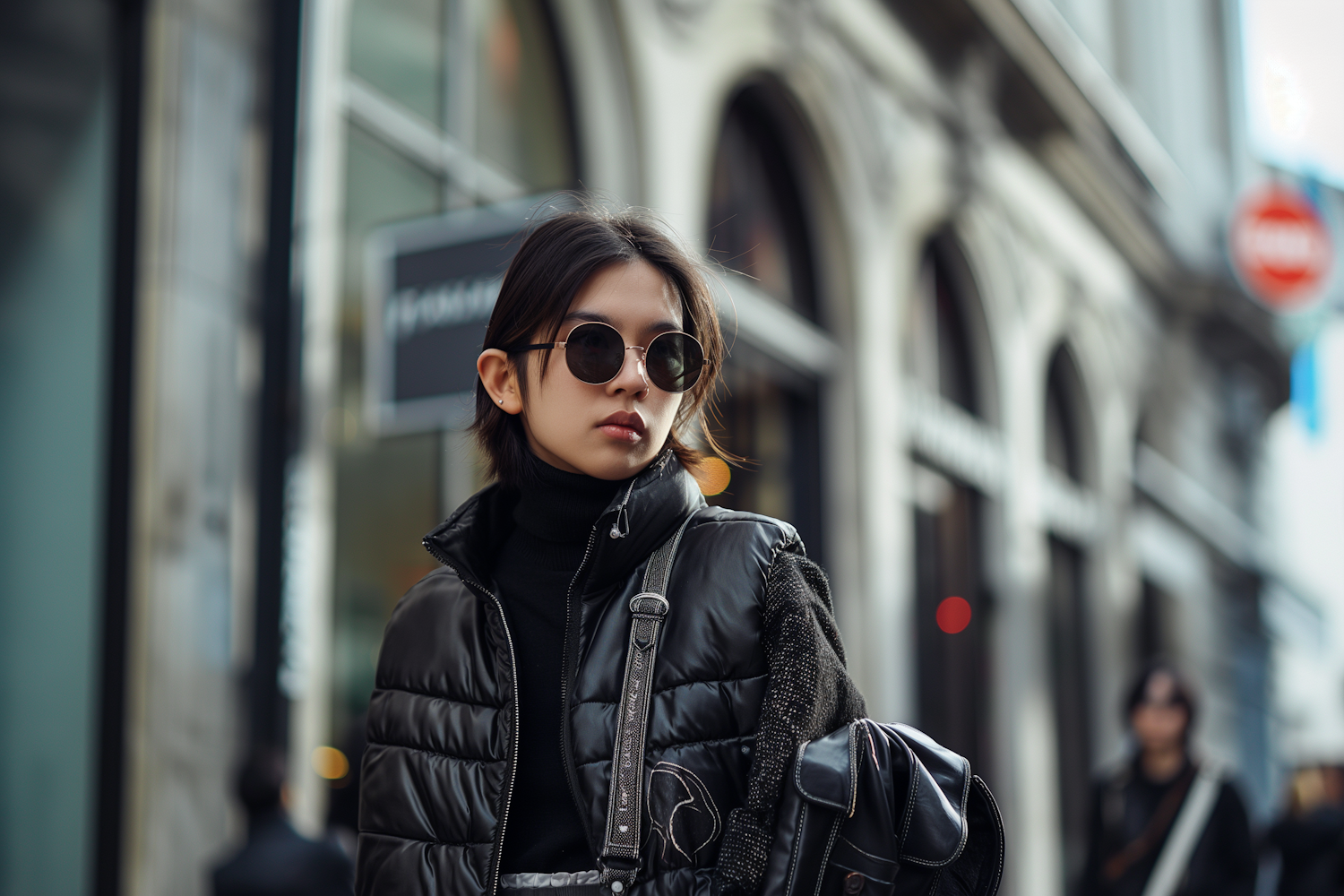 Stylish individual in black puffer jacket and sunglasses on a city street, exuding urban chic with a modern vibe.