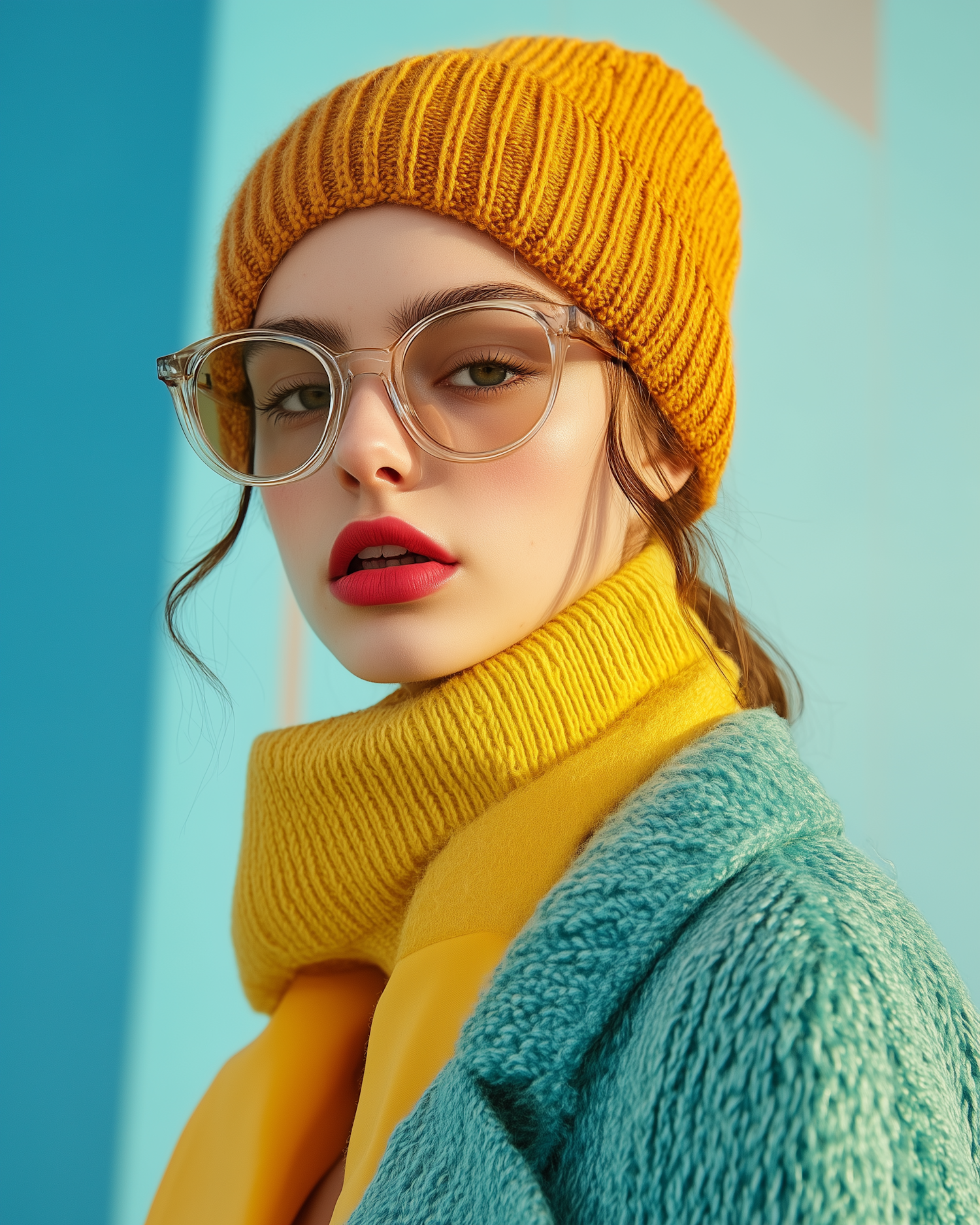 Stylish woman in yellow beanie and scarf with teal coat, clear glasses, and red lips against a blue background.