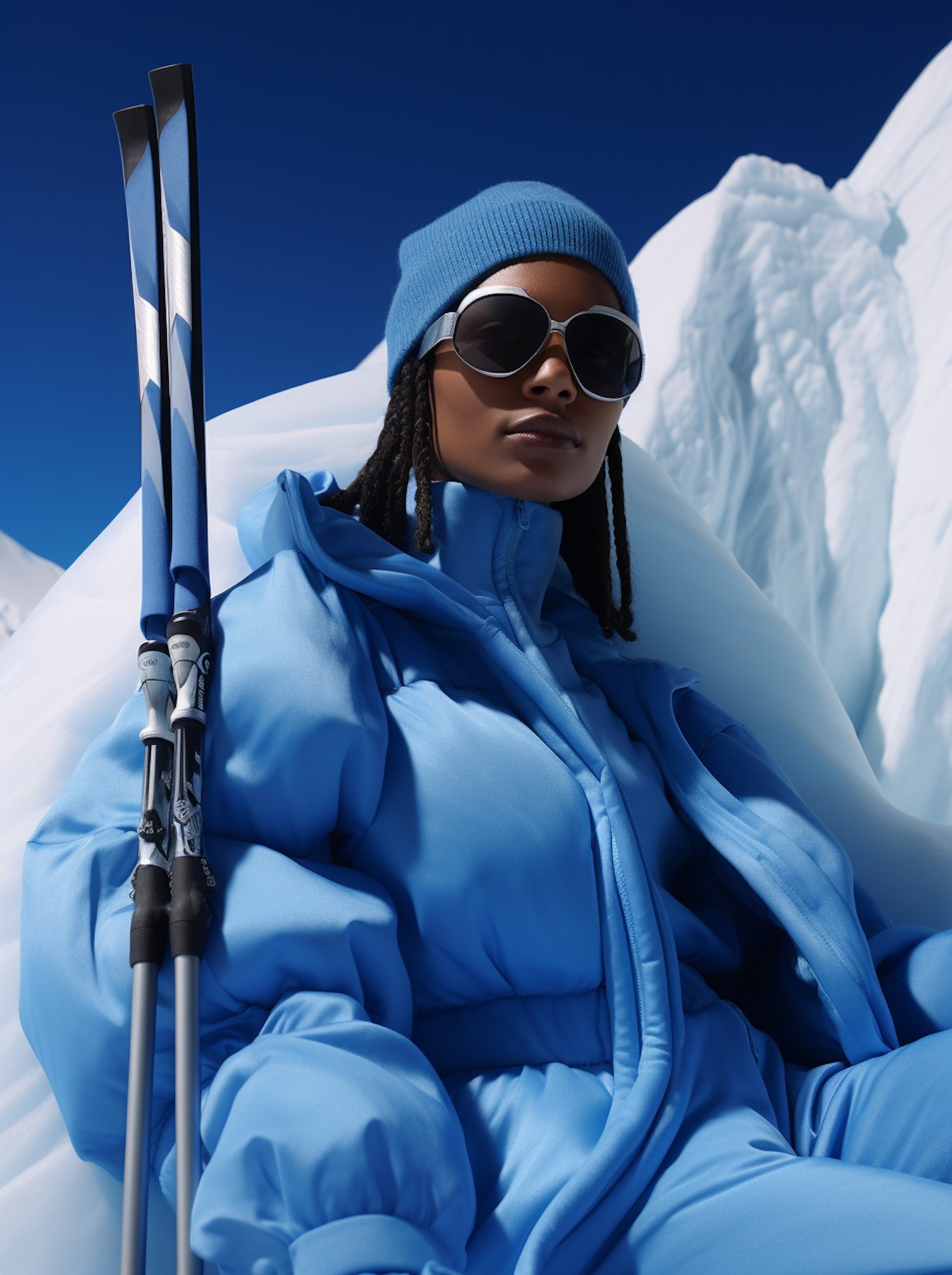Stylish skier in blue gear with sunglasses, ready for adventure against a stunning snowy backdrop.