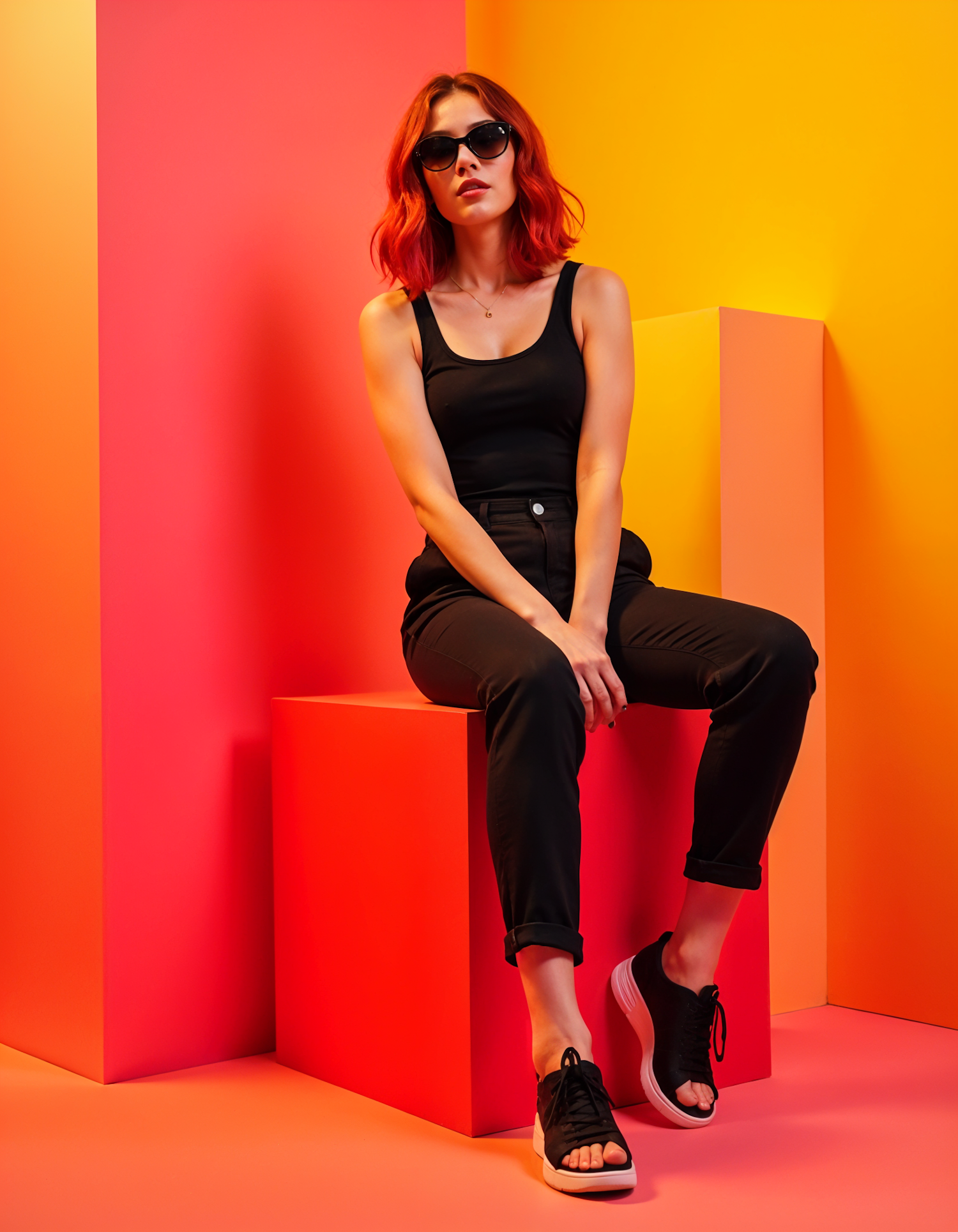 Stylish woman with red hair in black outfit and sunglasses sits against a bold yellow and pink background. Modern and vibrant aesthetic.