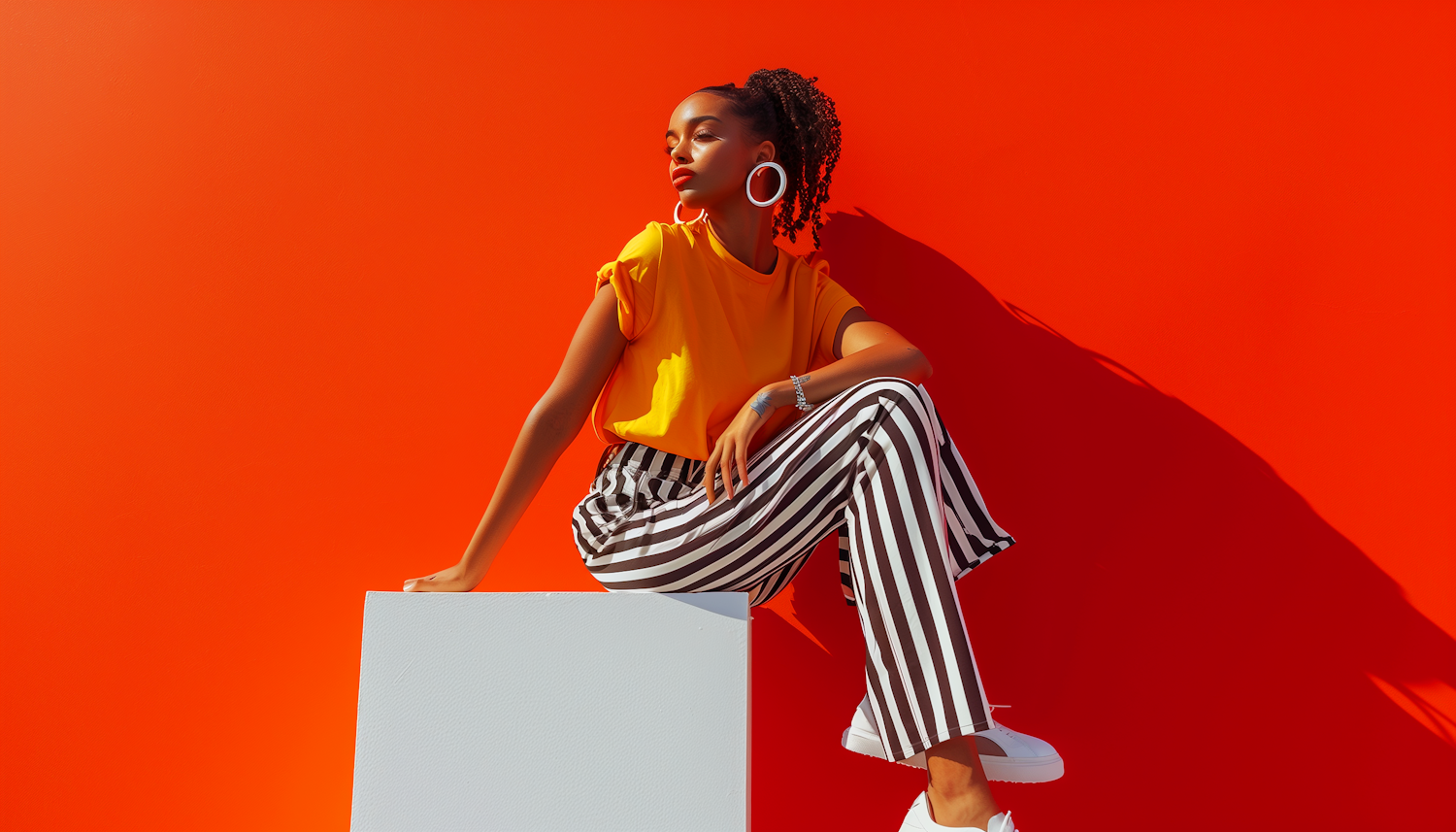 Stylish woman in yellow top and striped pants against a vibrant orange background, exuding confidence and elegance.