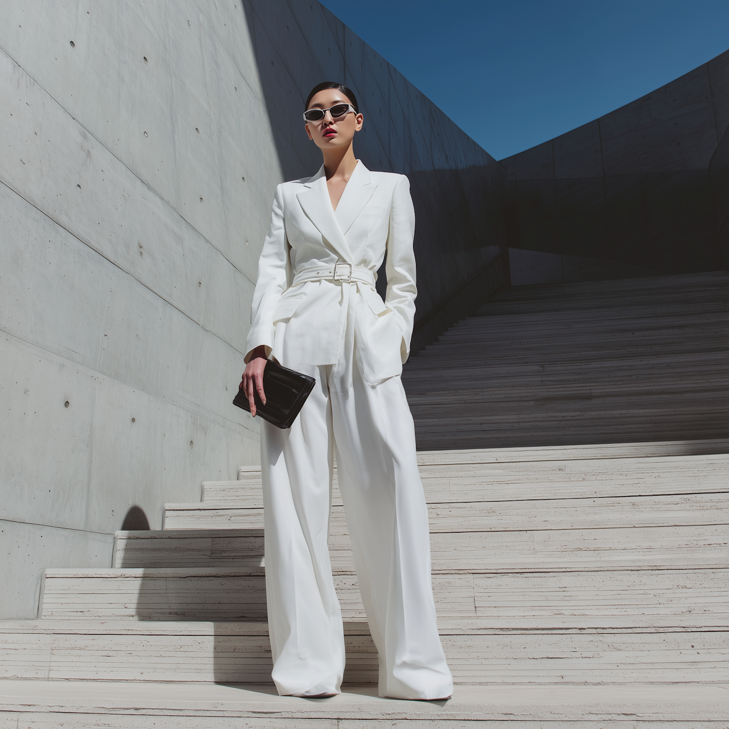 Stylish woman in a white suit with a black clutch, standing on modern stairs against a minimalist concrete wall and blue sky.