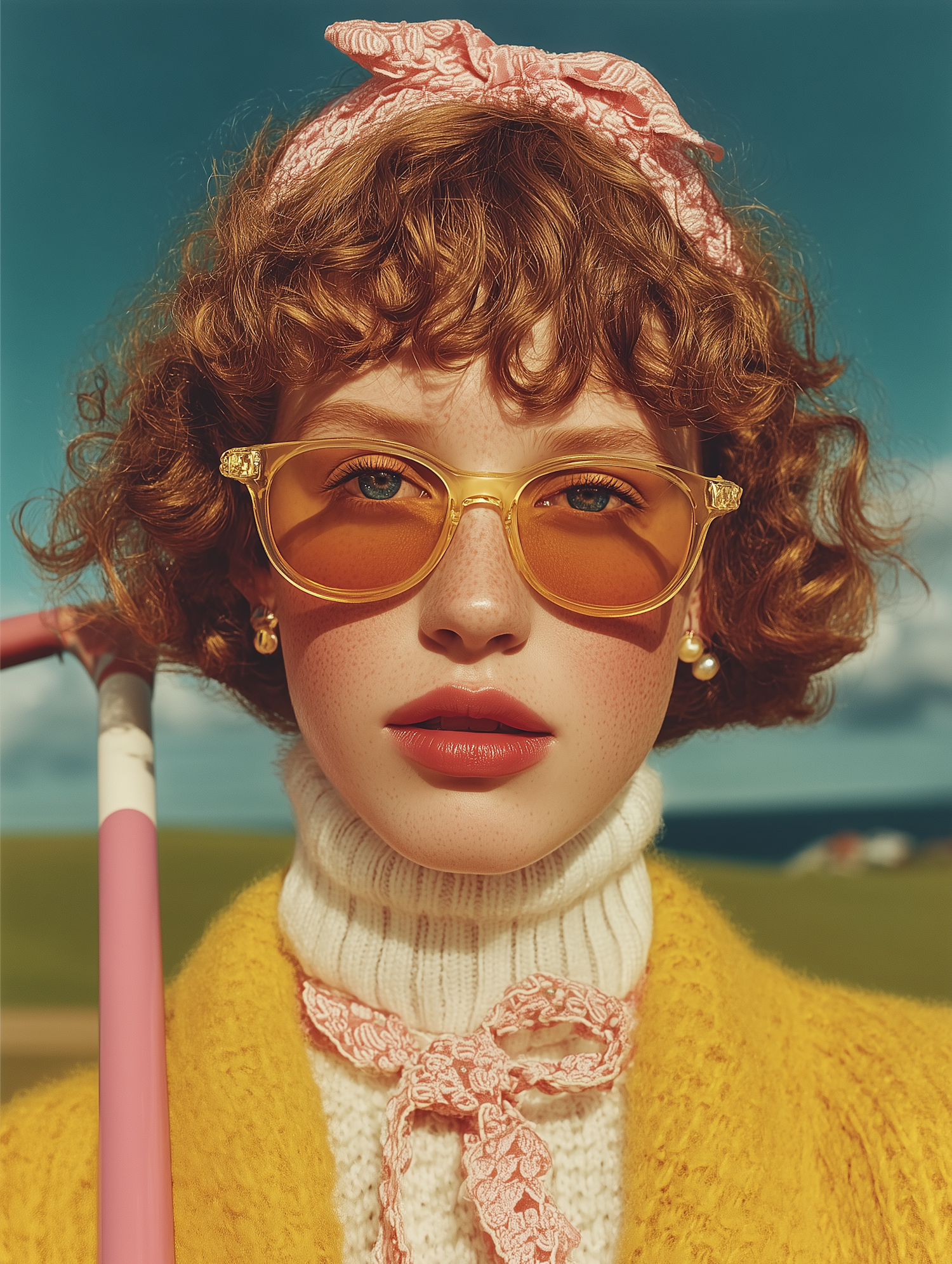 Stylish woman with red curls, orange sunglasses, and a yellow cardigan in a sunny outdoor setting. Retro vibes with a modern twist.