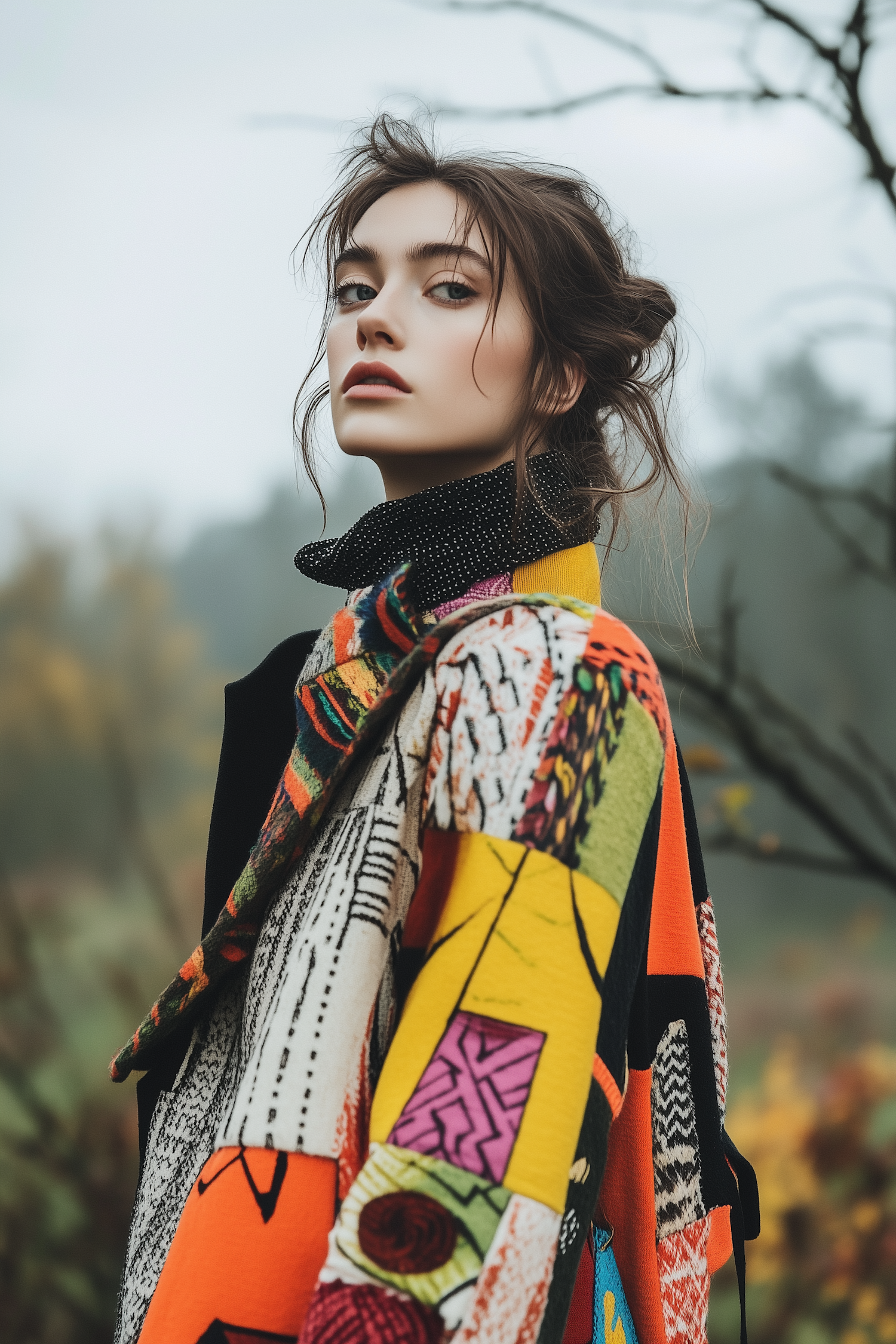 Stylish woman in a colorful patchwork coat and polka dot scarf, set against a misty natural background. Perfect blend of fashion and nature.