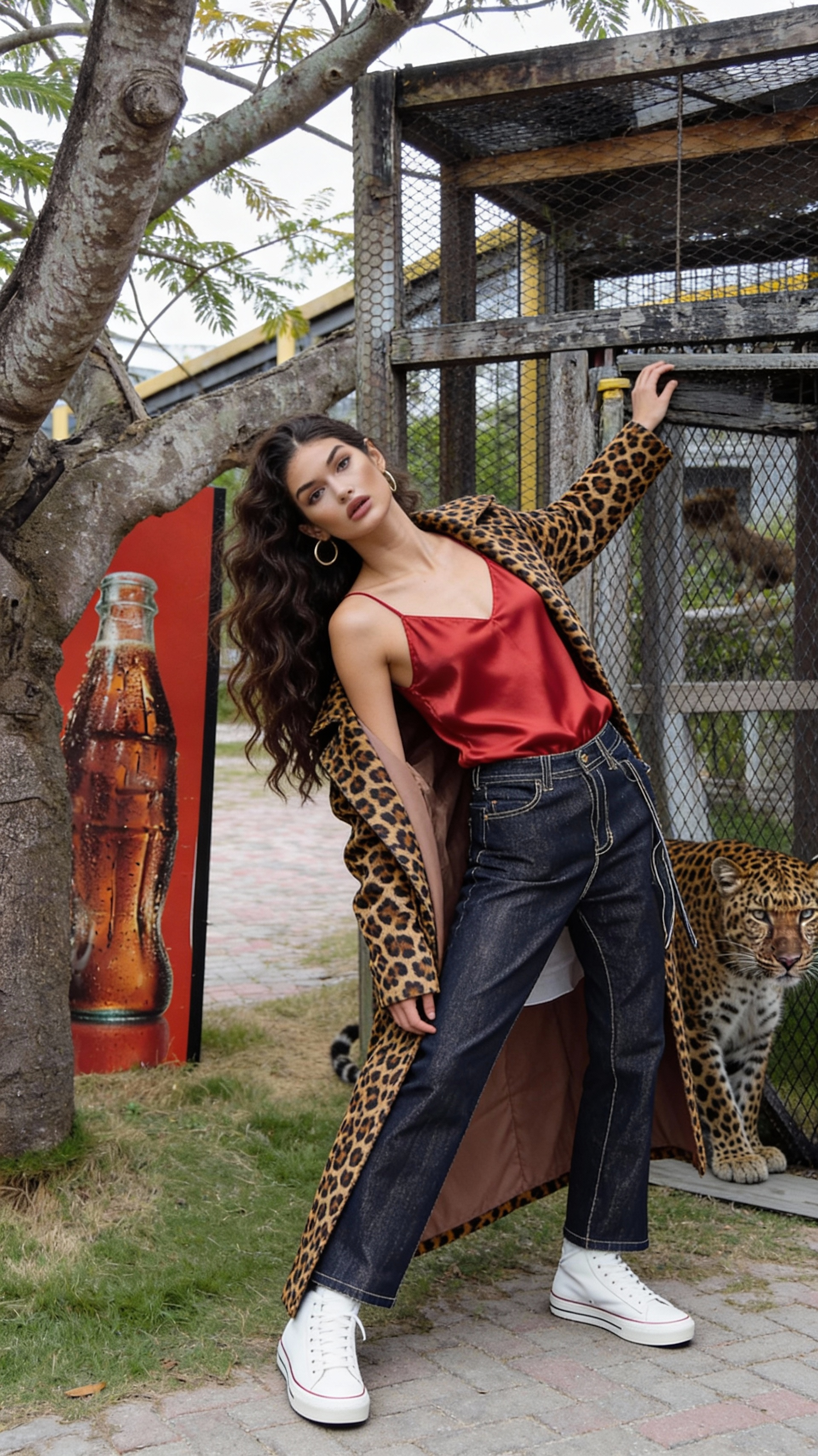 Stylish woman in leopard-print coat and red top poses near a leopard enclosure, blending fashion with an exotic backdrop.