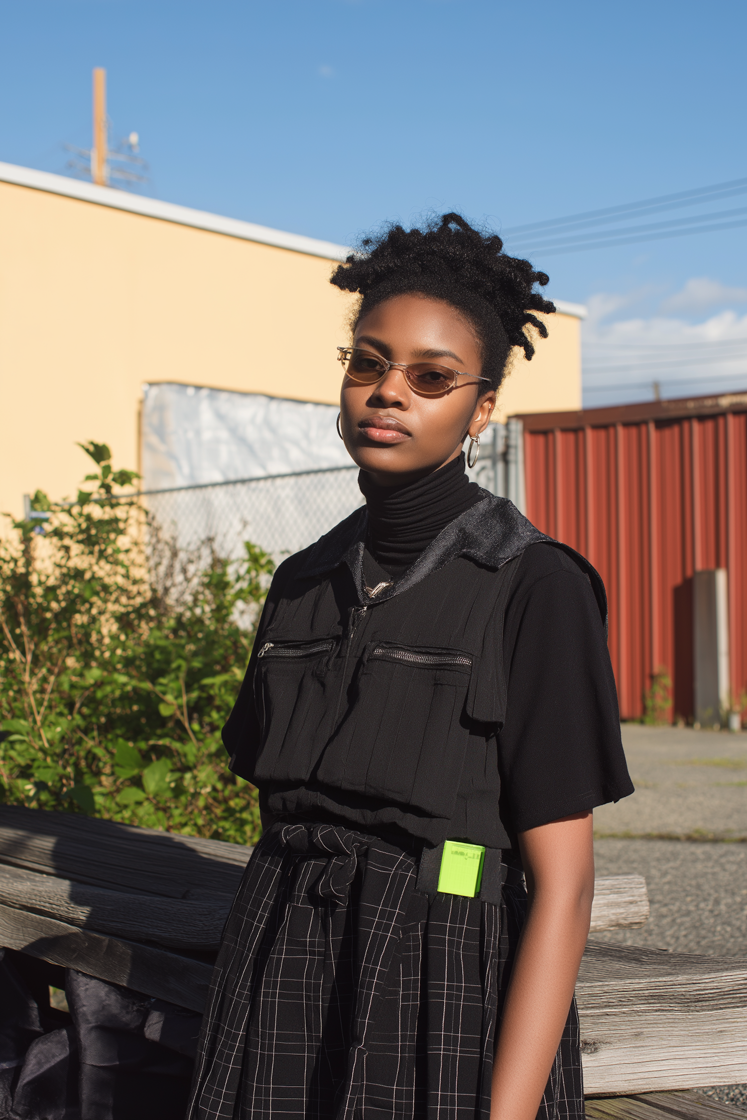Stylish woman in a black outfit and sunglasses poses outdoors against a sunny urban backdrop with vibrant colors and greenery.
