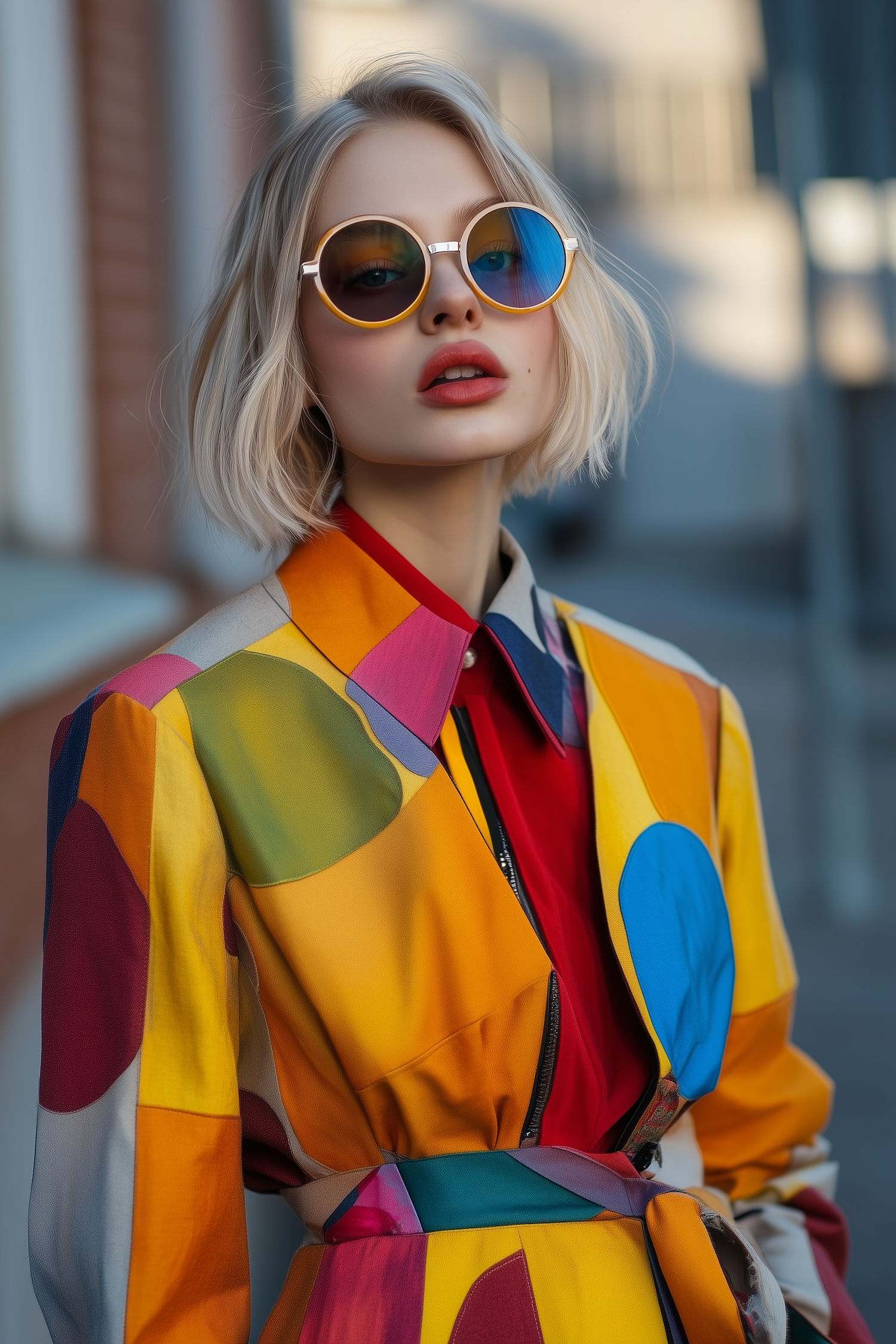 Chic woman in bold geometric jacket, round sunglasses, and platinum blonde hair, posing outdoors in an urban setting.