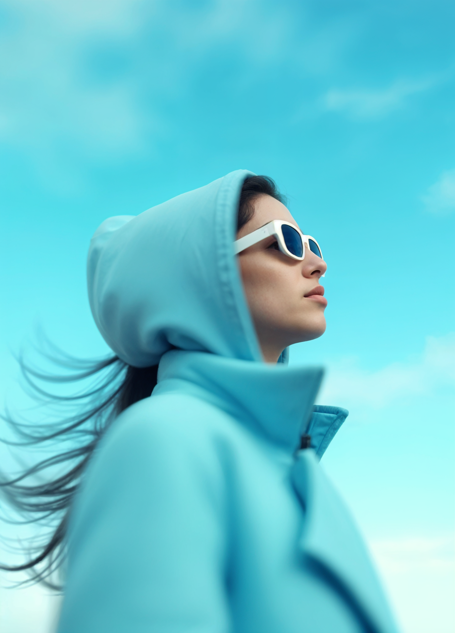 Stylish woman in a light blue hooded jacket and white sunglasses gazes upward against a vibrant blue sky. Hair flows gently in the wind.