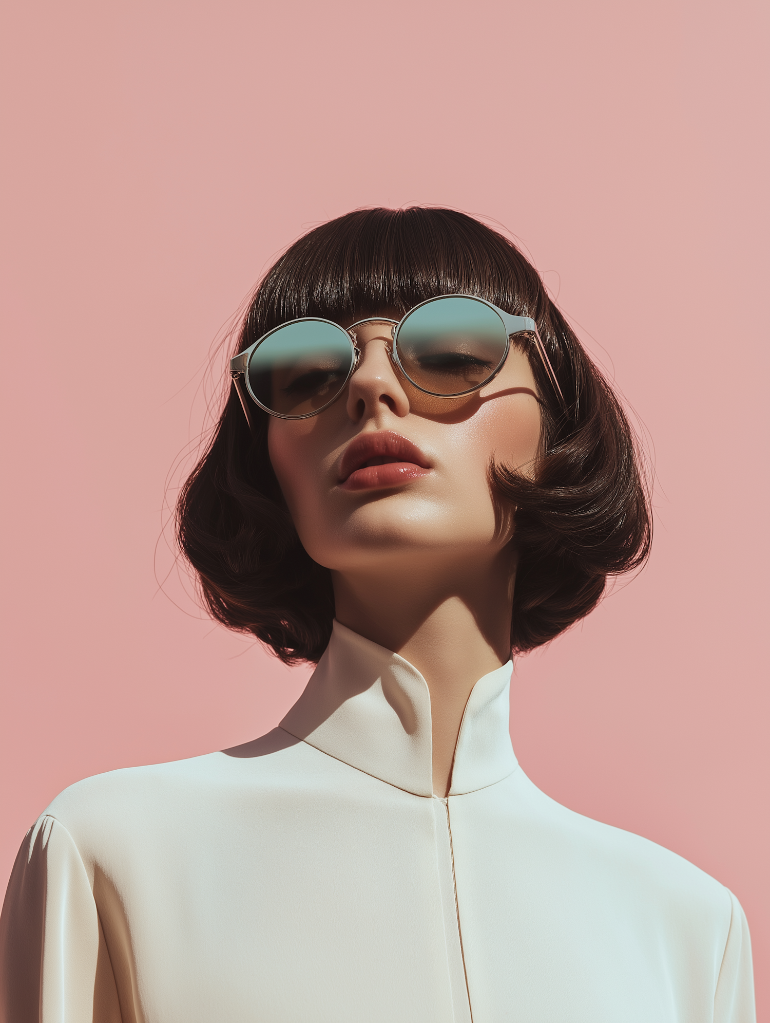 Chic woman with a sleek bob, reflective sunglasses, and a cream blouse against a pink backdrop. Minimalist and modern fashion vibes.