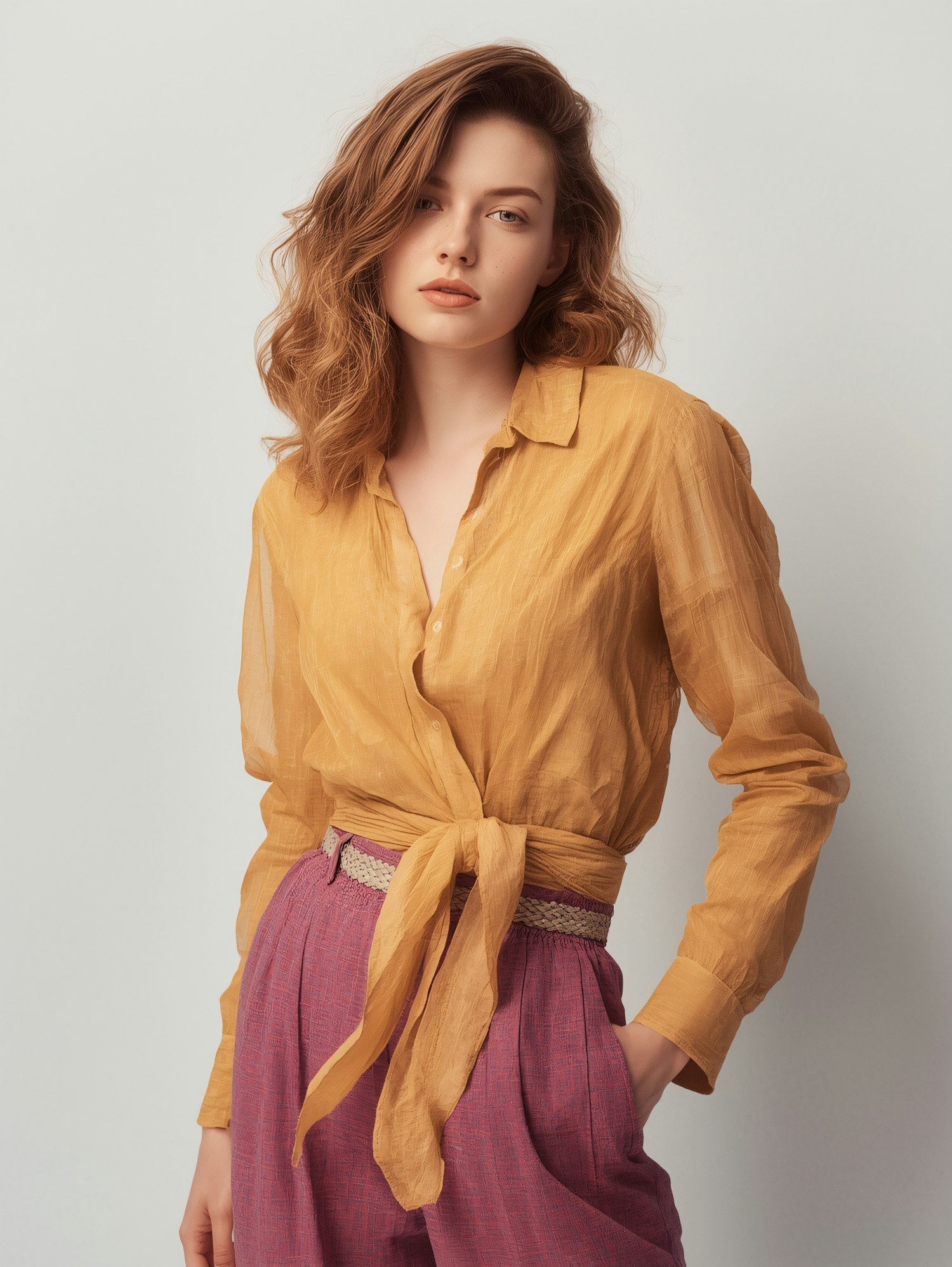 Stylish woman in a mustard blouse and magenta trousers, posing confidently against a neutral background.