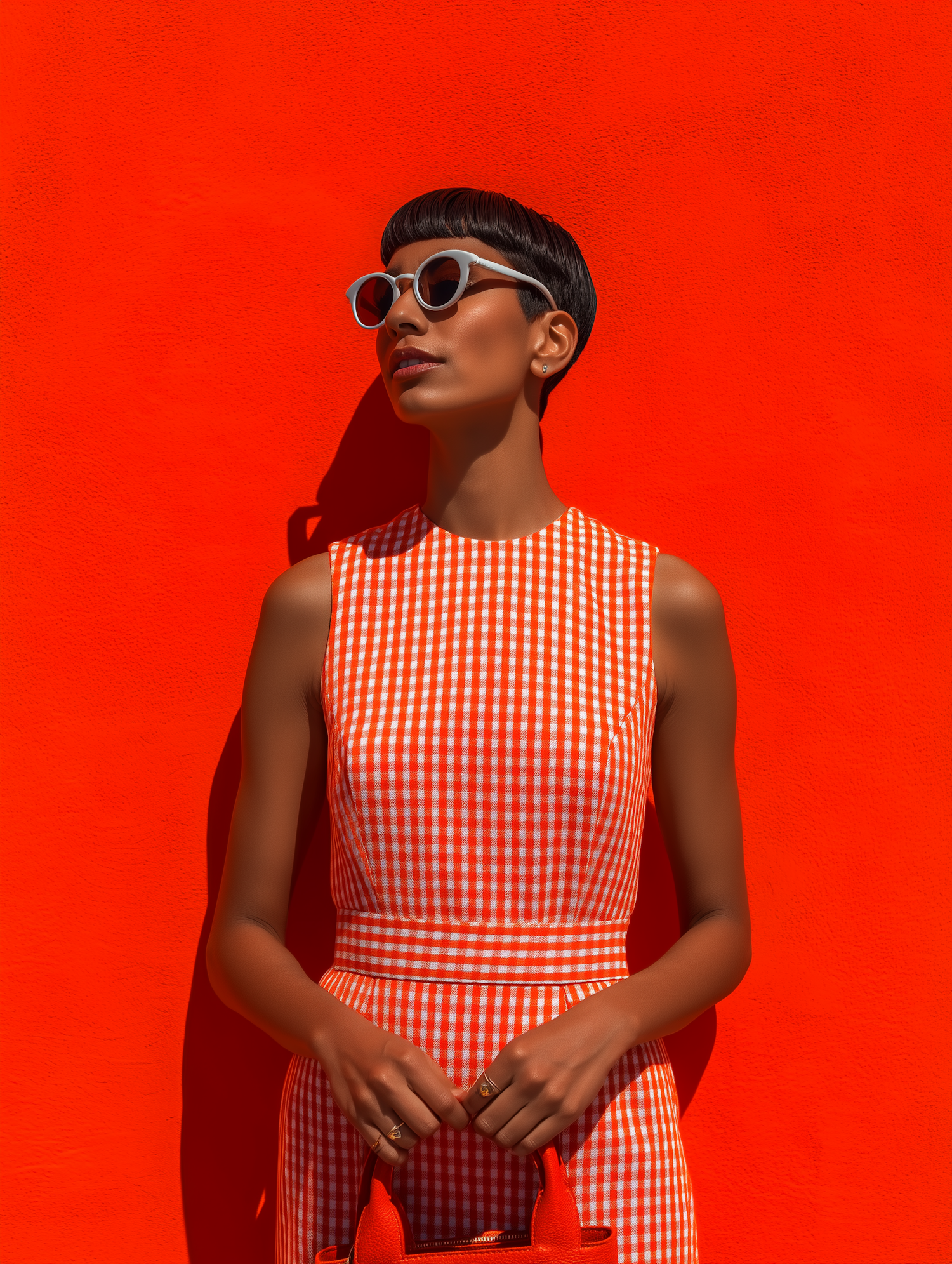 Chic woman in gingham dress and retro sunglasses poses against a bold orange wall, holding a red handbag. Vibrant and stylish aesthetic.