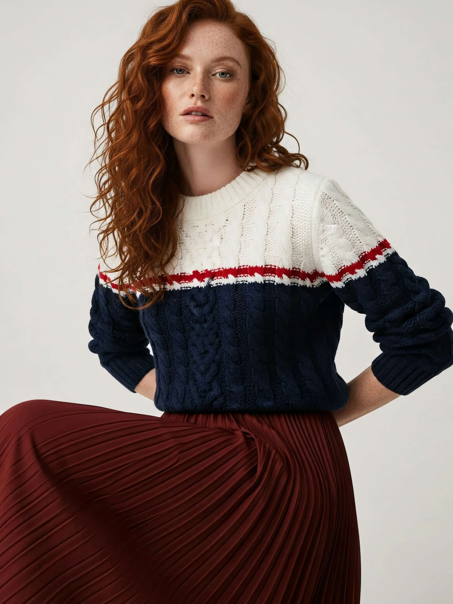A stylish woman in a navy and white sweater with red accents and a maroon pleated skirt, posing confidently against a neutral background.