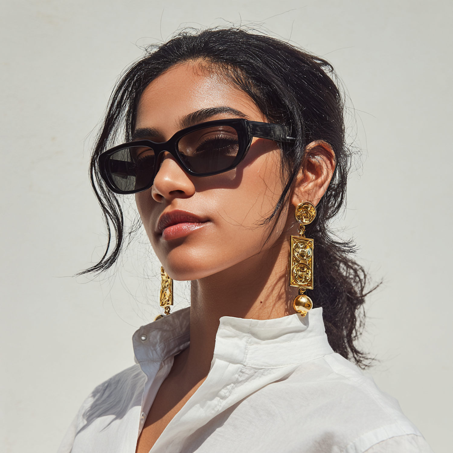 Stylish woman in black sunglasses and gold earrings, wearing a white shirt against a light background.