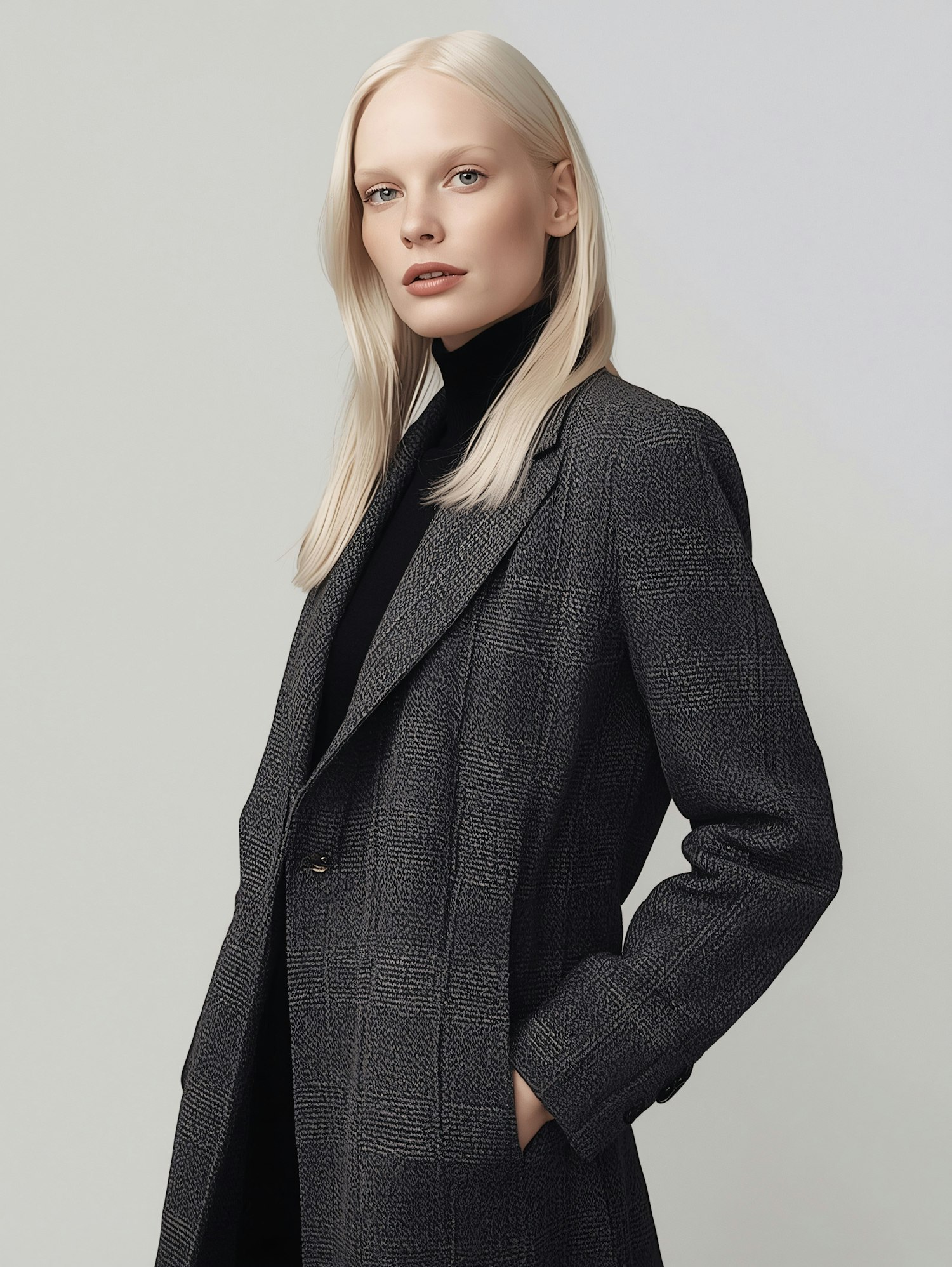 Stylish woman in a dark gray checkered coat and black turtleneck, posing against a light gray background.