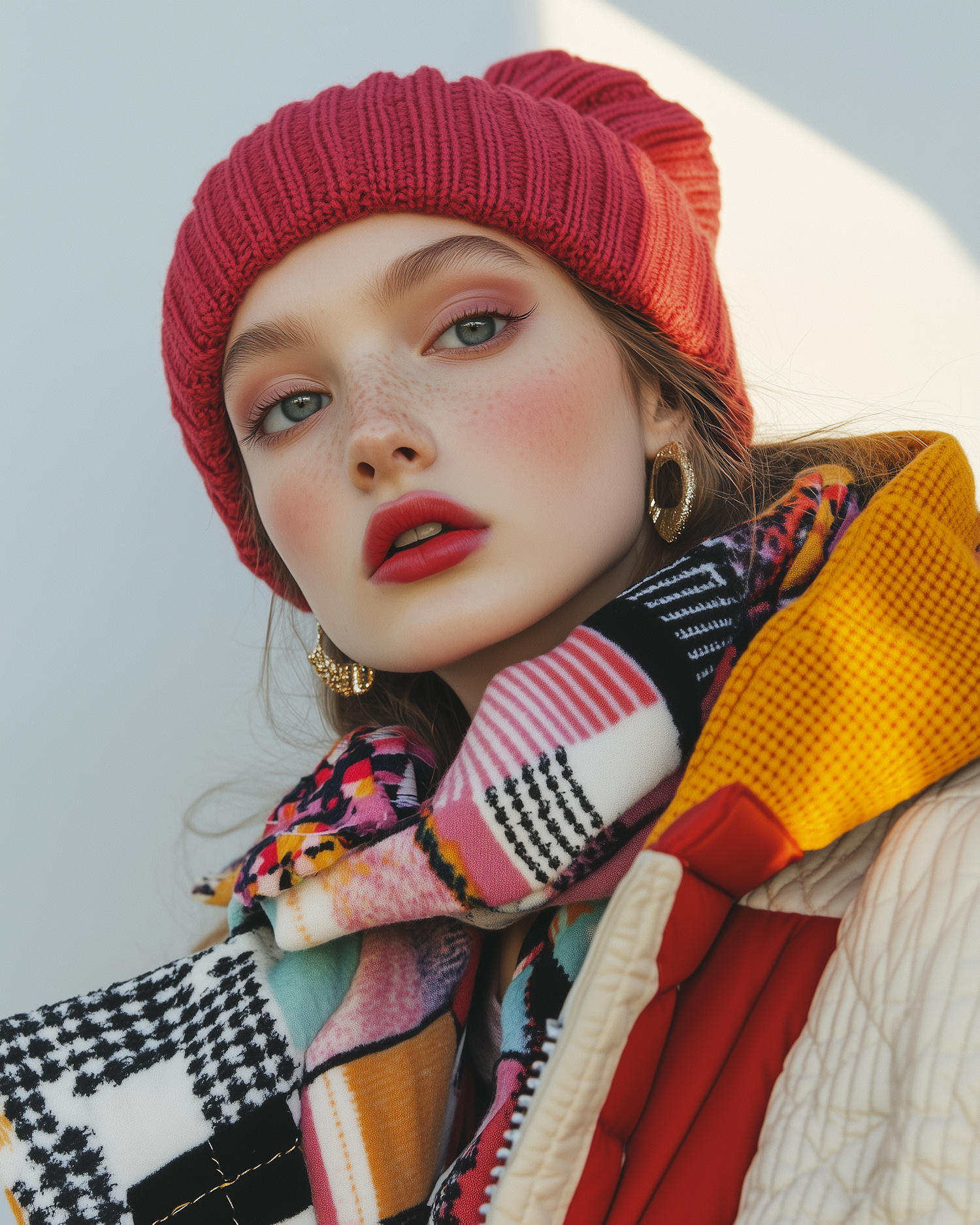 Stylish woman in a red beanie, bold makeup, and colorful scarf, exuding winter fashion vibes with a cozy quilted jacket.