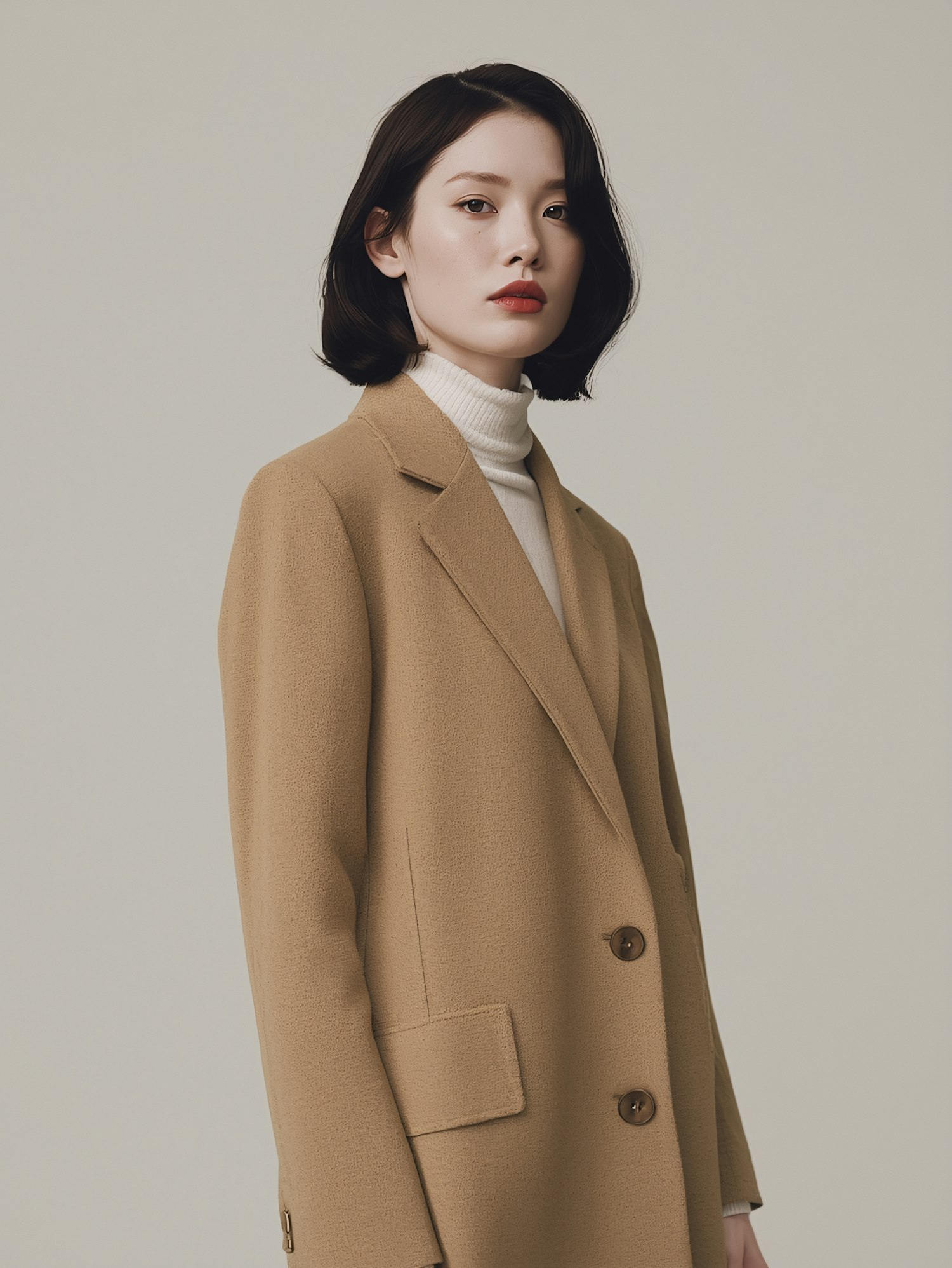 Stylish woman in a beige coat and white turtleneck, exuding elegance against a minimalistic light background.