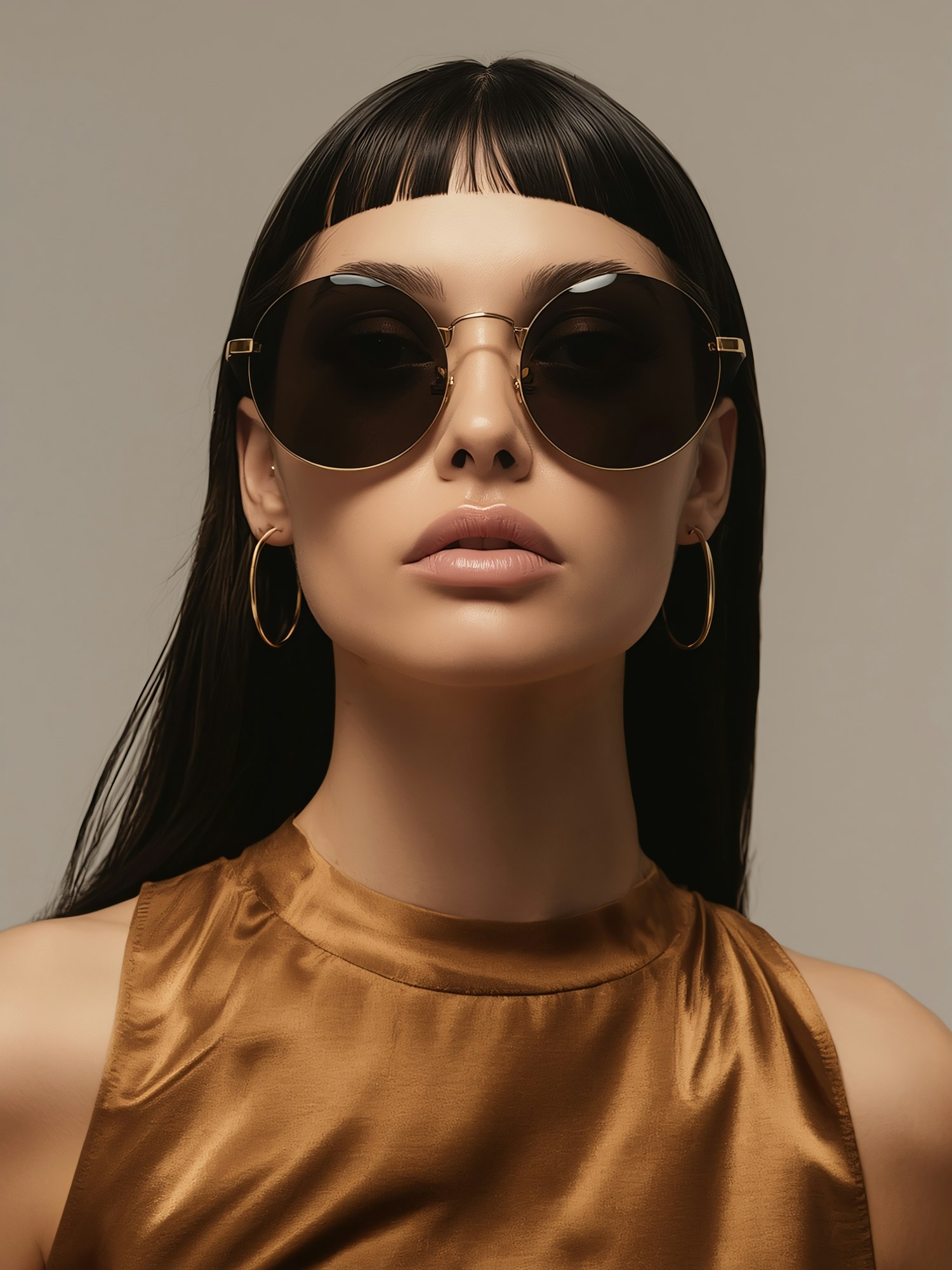 Stylish woman in round sunglasses and a bronze top, accessorized with gold hoop earrings, against a neutral background.
