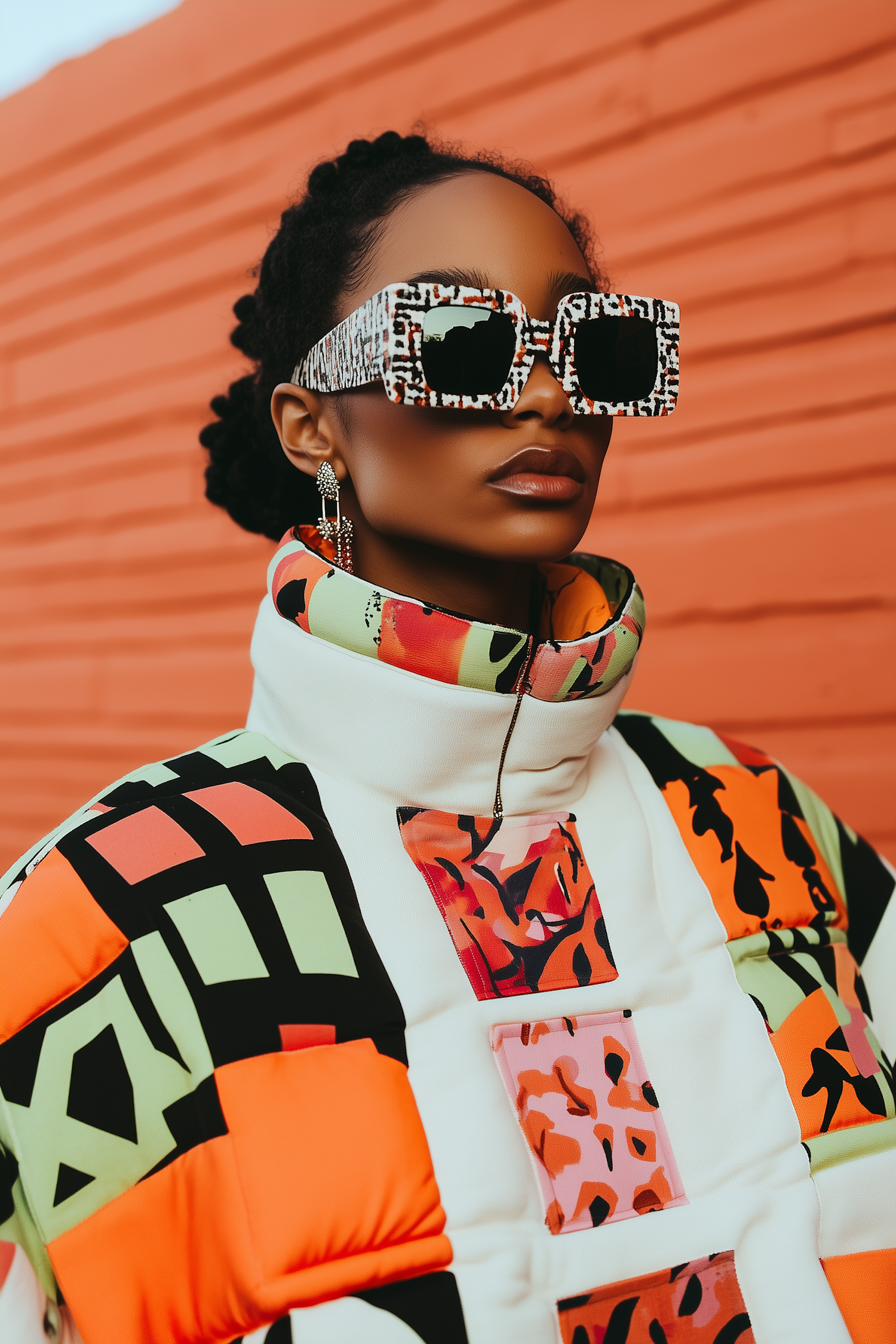 Bold fashion statement with oversized animal print sunglasses, colorful patterned puffer jacket, and elegant earrings against an orange wall.