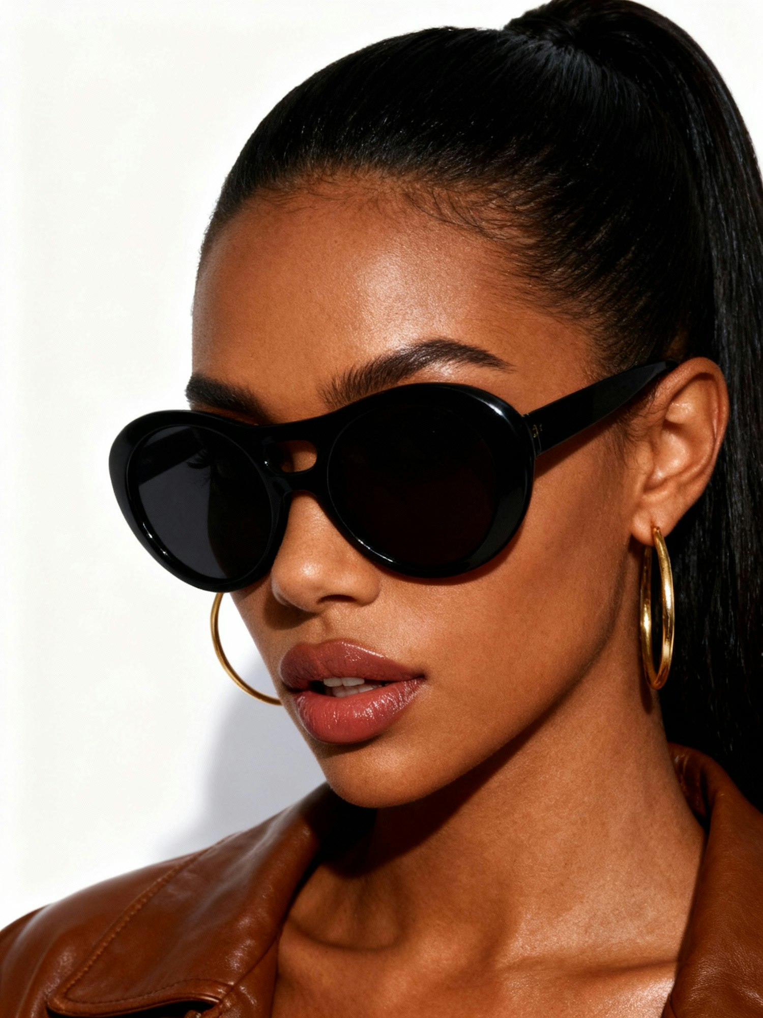 Stylish woman in black sunglasses and gold hoop earrings, wearing a brown leather jacket against a bright white background.