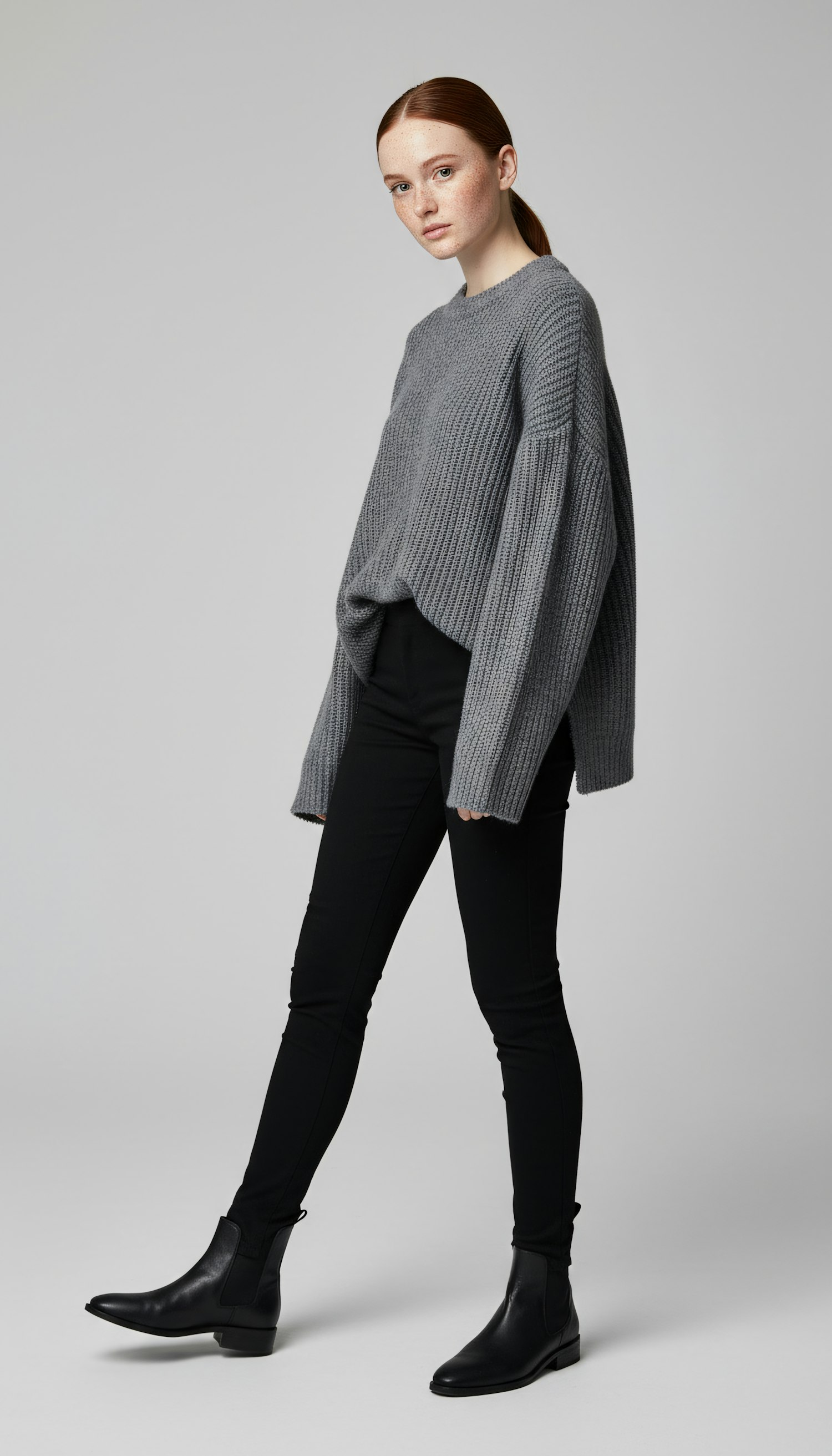A young woman in a gray sweater and black pants stands against a light gray background, showcasing a minimalist and stylish look.