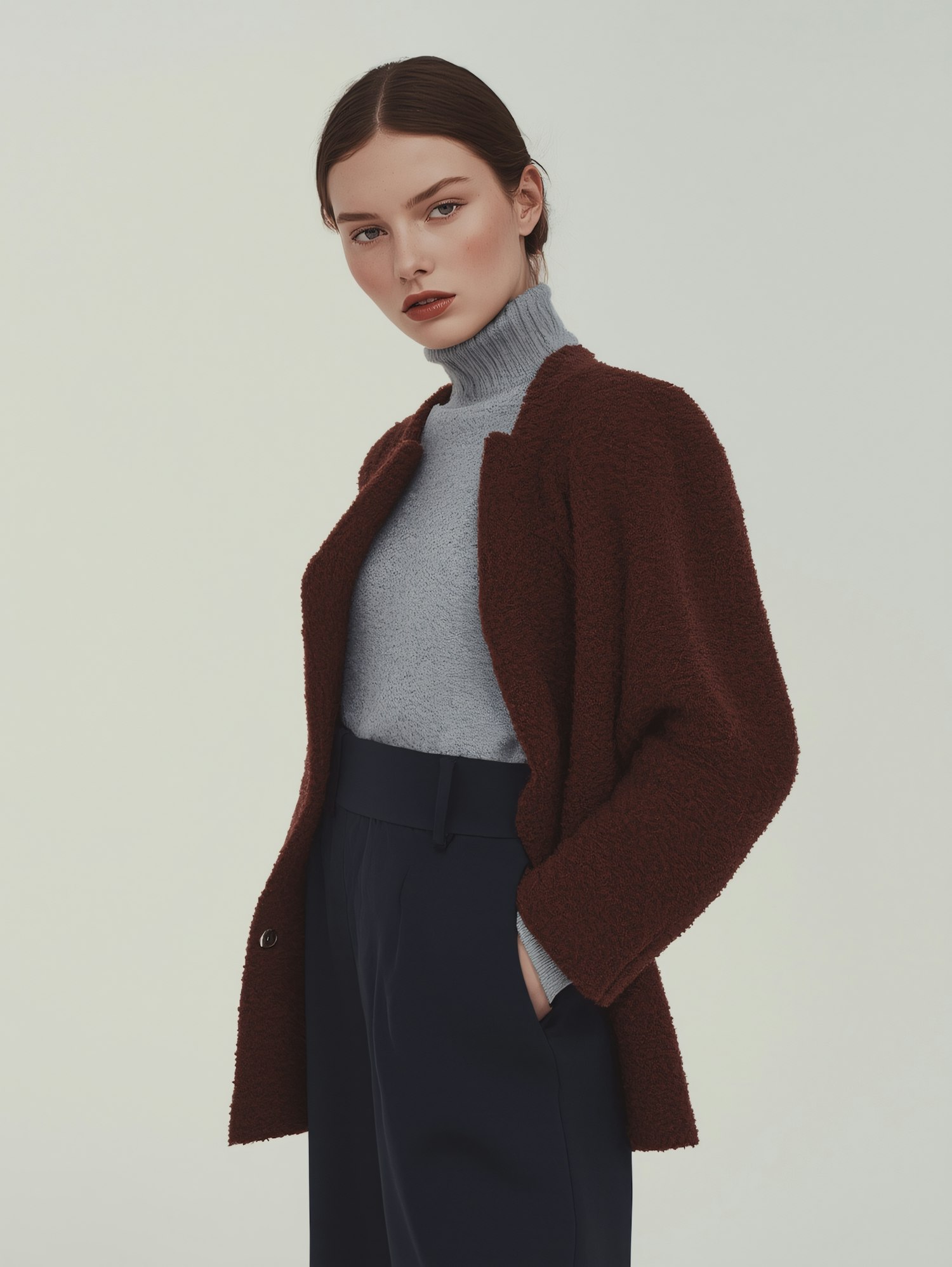Stylish woman in a burgundy coat, gray turtleneck, and navy trousers, posing against a light background with a confident expression.