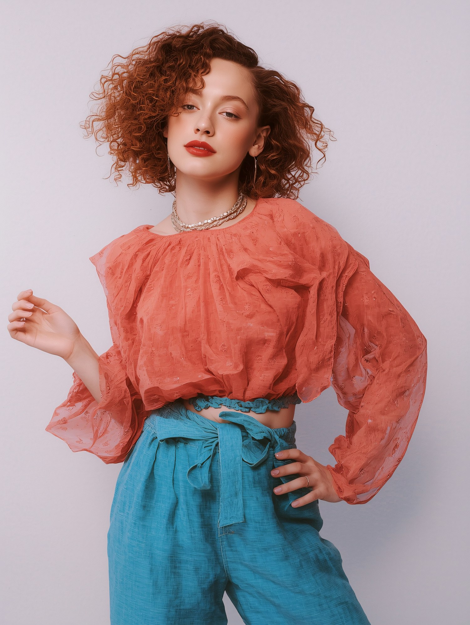Stylish woman in a coral blouse and blue pants, accessorized with silver jewelry, posing confidently against a plain background.