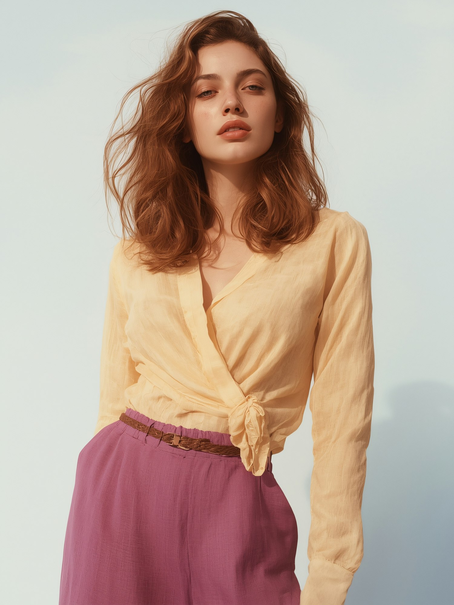 Stylish woman in a yellow wrap blouse and magenta trousers, posing confidently against a soft blue background.