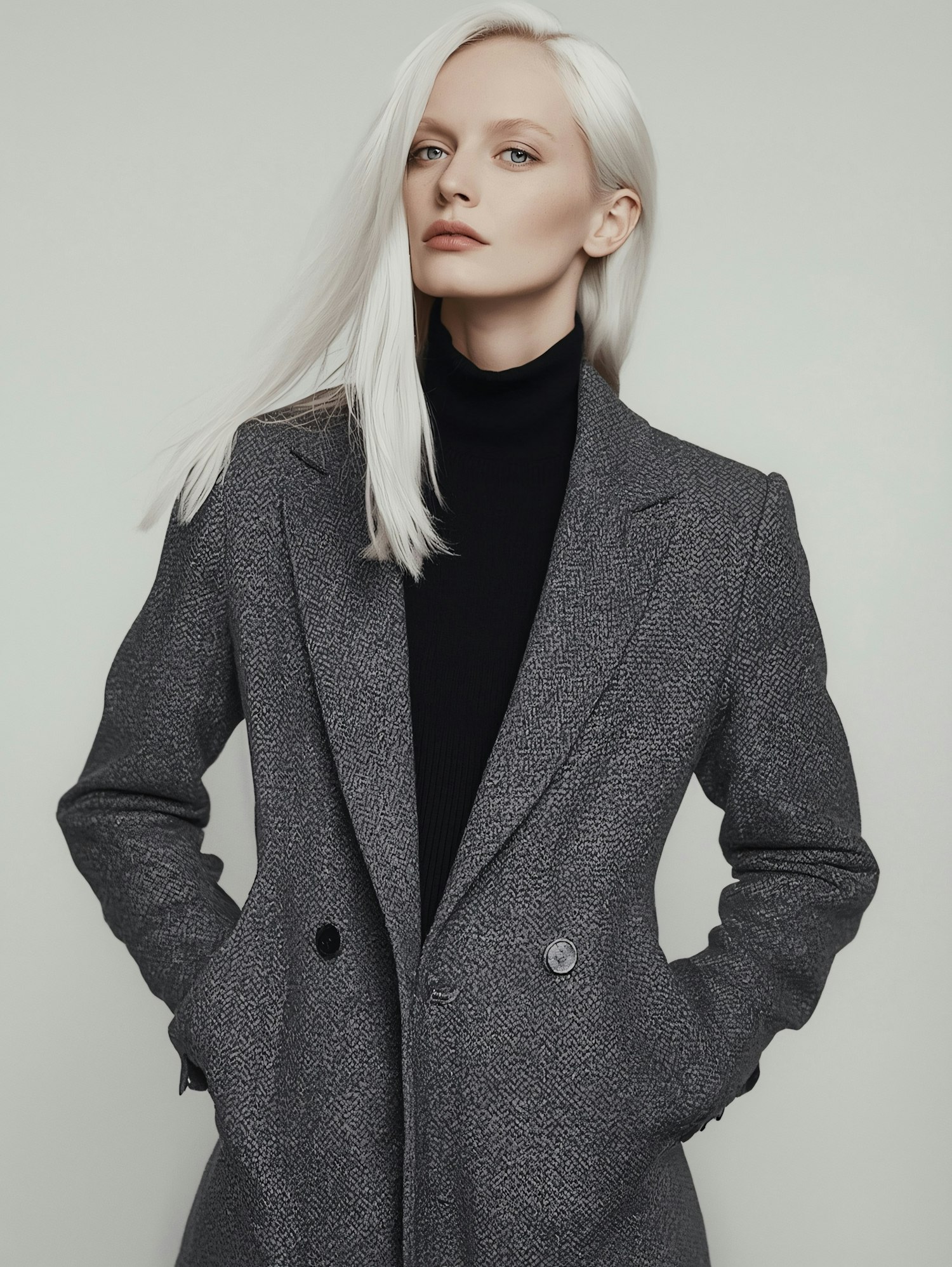Stylish woman with platinum blonde hair in a gray coat and black turtleneck, posing confidently against a neutral background.