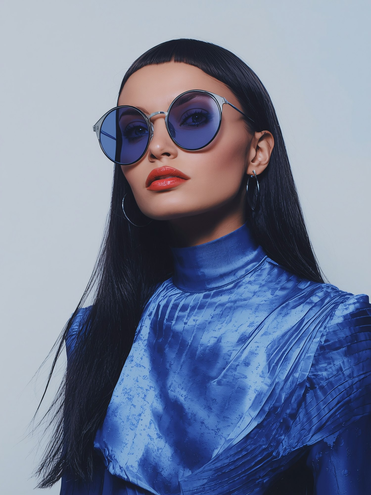 Stylish woman in blue satin blouse and round sunglasses, showcasing bold makeup and sleek black hair against a light blue background.
