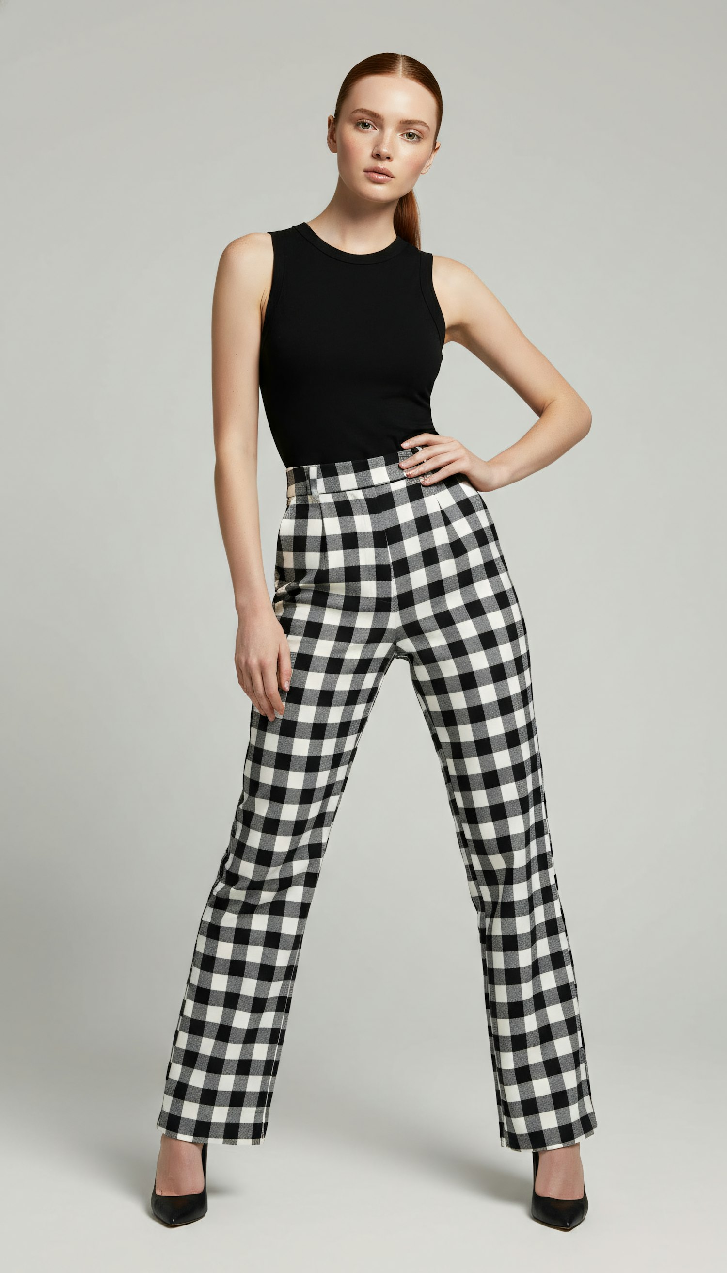 A stylish woman in a black top and checkered pants poses confidently, showcasing a modern and chic outfit.