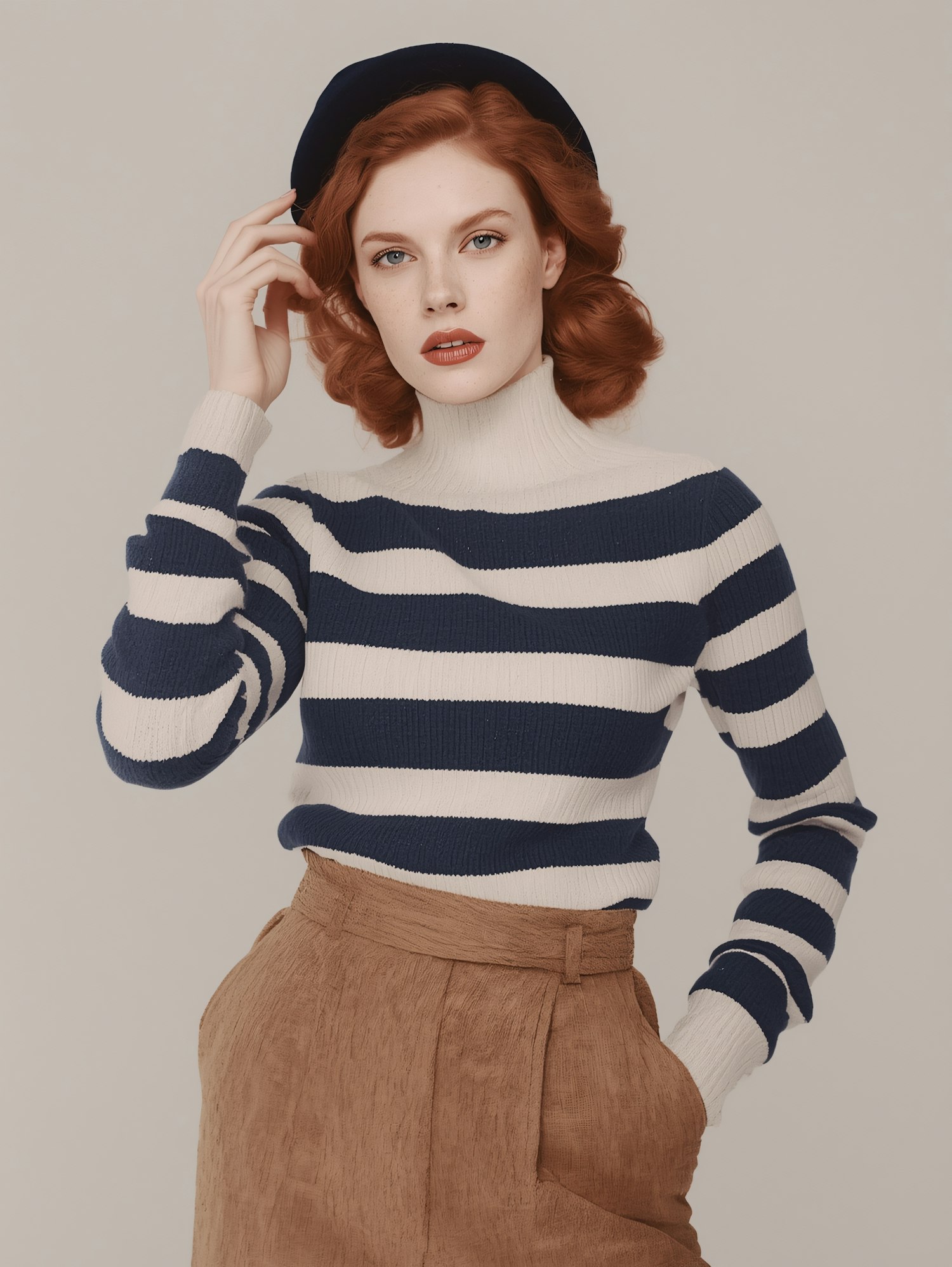 Stylish woman in a striped sweater and beret, showcasing a chic and timeless look with soft waves and neutral tones.