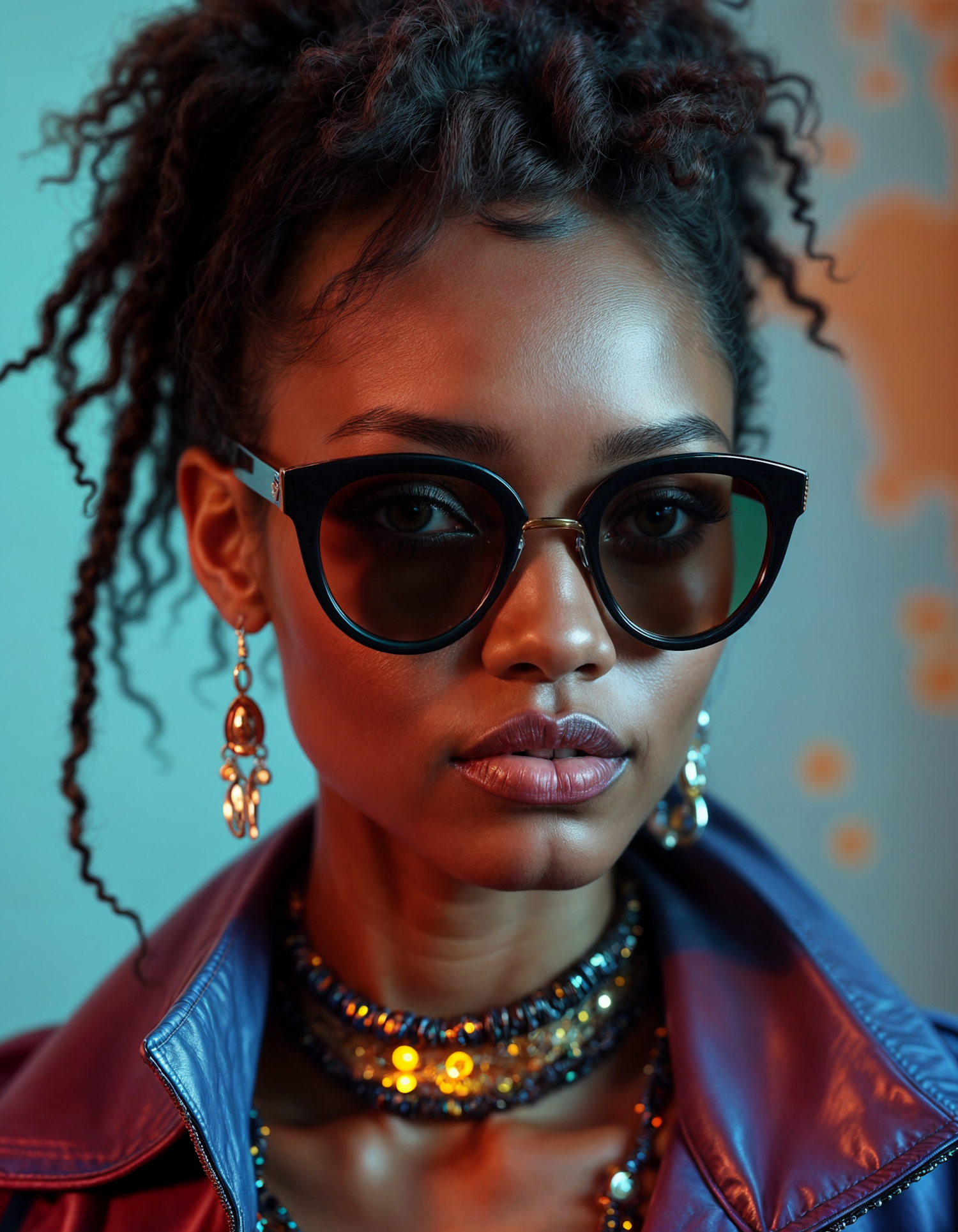 Close-up of a stylish woman in oversized sunglasses, bold jewelry, and a glossy purple jacket against a teal and orange background.