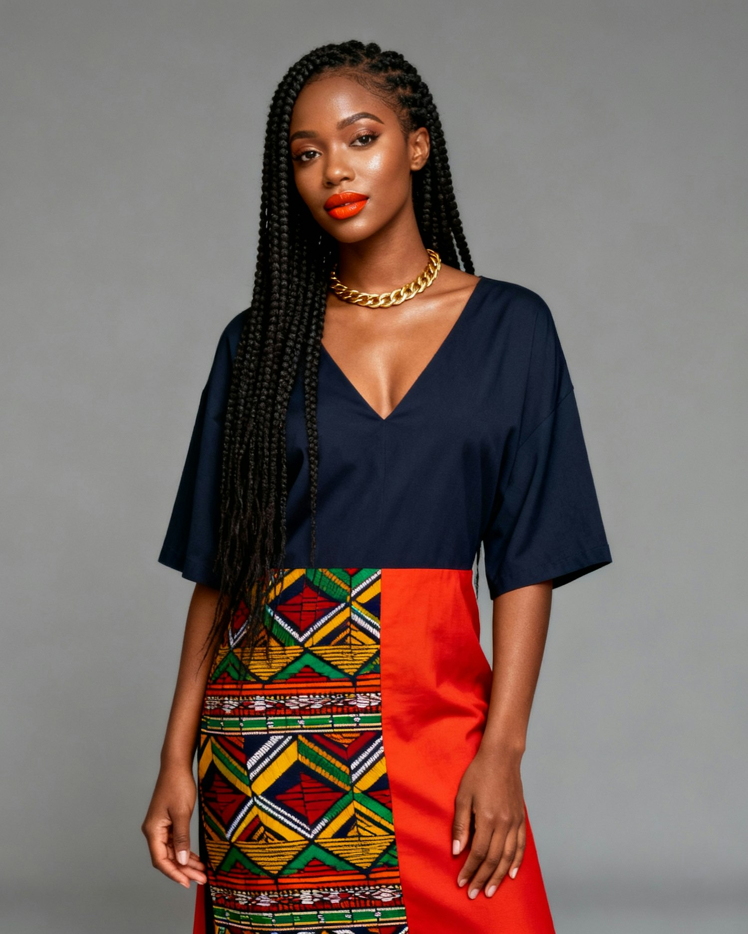 A woman in a navy top and vibrant patterned skirt, accessorized with a gold necklace, stands confidently against a neutral background.